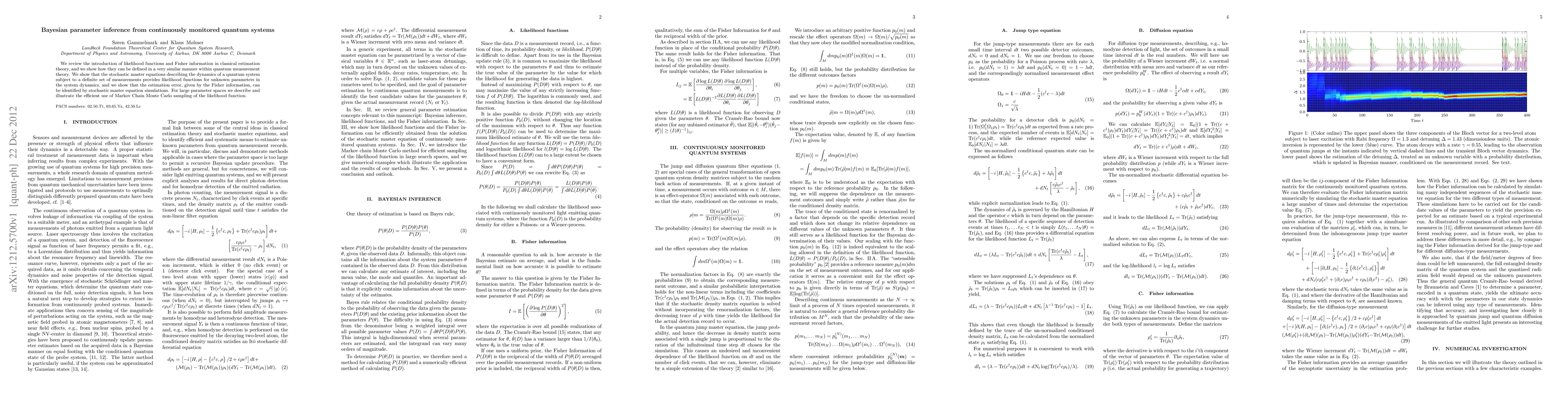 We review the introduction of likelihood functions and Fisher information in classical estimation theory, and we show how they can be defined in a very similar manner within quantum measurement theory. We show that the stochastic master equations describing the dynamics of a quantum system subject to a definite set of measurements provides likelihood functions for unknown parameters in the system dynamics, and we show that the estimation error, given by the Fisher information, can be identified by stochastic master equation simulations. For large parameter spaces we describe and illustrate the efficient use of Markov Chain Monte Carlo sampling of the likelihood function.