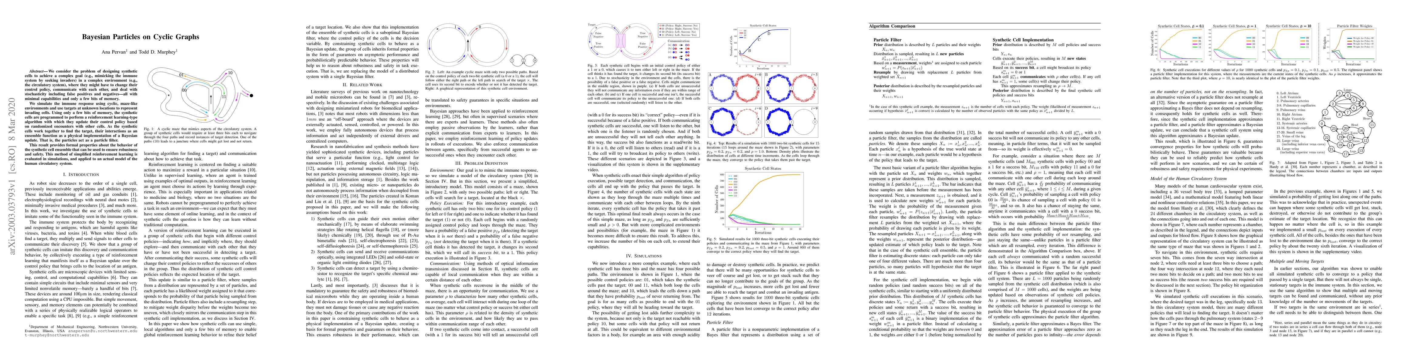 We consider the problem of designing synthetic cells to achieve a complex goal (e.g., mimicking the immune system by seeking invaders) in a complex environment (e.g., the circulatory system), where they might have to change their control policy, communicate with each other, and deal with stochasticity including false positives and negatives---all with minimal capabilities and only a few bits of memory. We simulate the immune response using cyclic, maze-like environments and use targets at unknown locations to represent invading cells. Using only a few bits of memory, the synthetic cells are programmed to perform a reinforcement learning-type algorithm with which they update their control policy based on randomized encounters with other cells. As the synthetic cells work together to find the target, their interactions as an ensemble function as a physical implementation of a Bayesian update. That is, the particles act as a particle filter. This result provides formal properties about the behavior of the synthetic cell ensemble that can be used to ensure robustness and safety. This method of simplified reinforcement learning is evaluated in simulations, and applied to an actual model of the human circulatory system.
