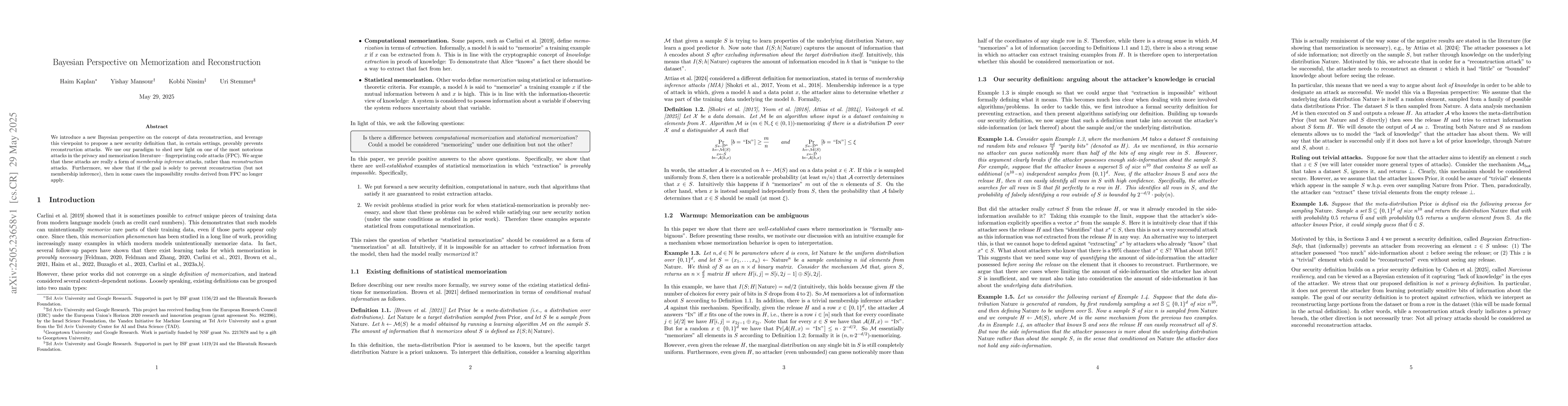 The paper introduces a Bayesian perspective on data reconstruction, proposing a new security definition that prevents reconstruction attacks in certain settings. It analyzes fingerprinting code attacks (FPC) as a form of membership inference attacks rather than reconstruction attacks, showing that impossibility results for FPC do not apply when the goal is solely to prevent reconstruction.
