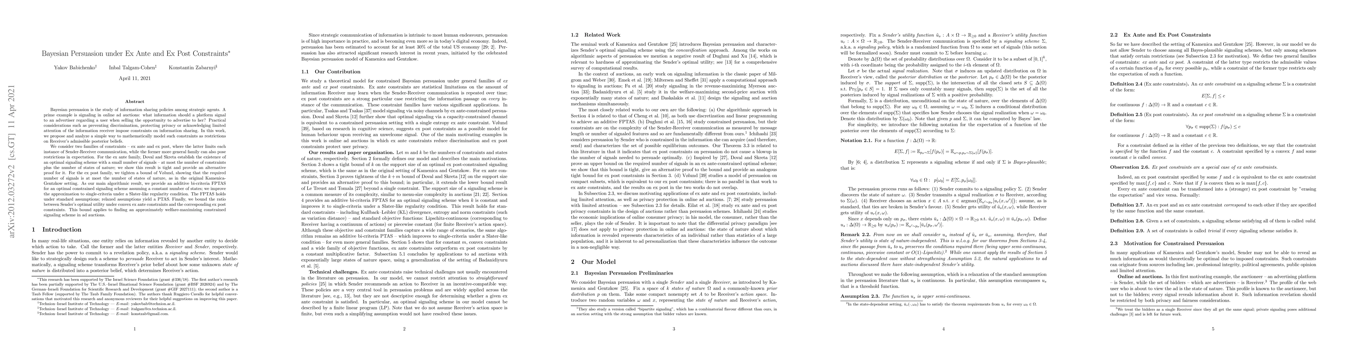 This paper explores Bayesian persuasion under ex ante and ex post constraints, proposing mathematical models to represent these constraints as restrictions on the receiver's posterior beliefs. The authors provide tight results for optimal signaling schemes under both constraint types and develop an additive bi-criteria FPTAS for constrained signaling, improving under certain regularity conditions.