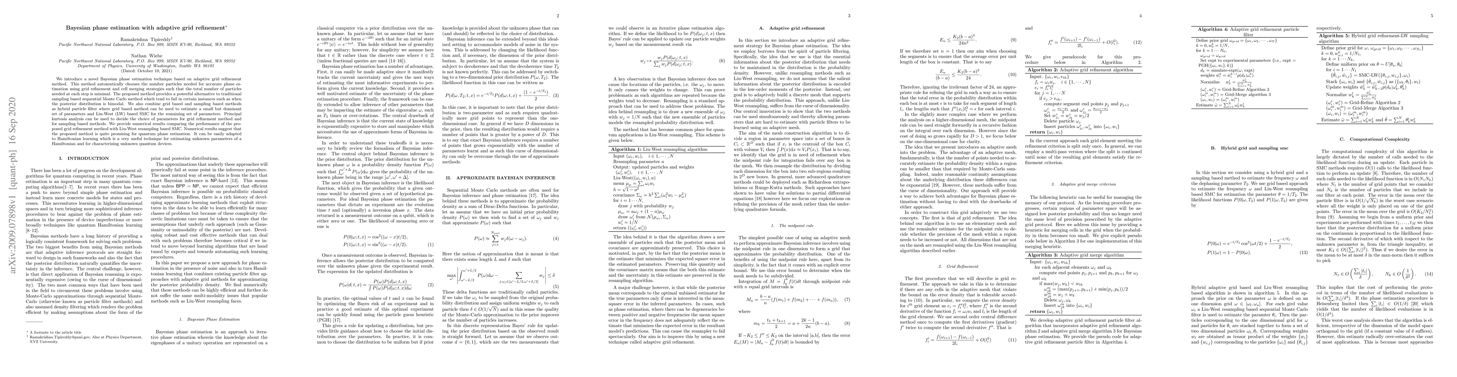 We introduce a novel Bayesian phase estimation technique based on adaptive grid refinement method. This method automatically chooses the number particles needed for accurate phase estimation using grid refinement and cell merging strategies such that the total number of particles needed at each step is minimal. The proposed method provides a powerful alternative to traditional sampling based sequential Monte Carlo method which tend to fail in certain instances such as when the posterior distribution is bimodal. We also combine grid based and sampling based methods as hybrid particle filter where grid based method can be used to estimate a small but dominant set of parameters and Liu-West (LW) based SMC for the remaining set of parameters. Principal kurtosis analysis can be used to decide the choice of parameters for grid refinement method and for sampling based methods. We provide numerical results comparing the performance of the proposed grid refinement method with Liu-West resampling based SMC. Numerical results suggest that the proposed method is quite promising for quantum phase estimation. It can be easily adapted to Hamiltonian learning which is a very useful technique for estimating unknown parameters of a Hamiltonian and for characterizing unknown quantum devices.
