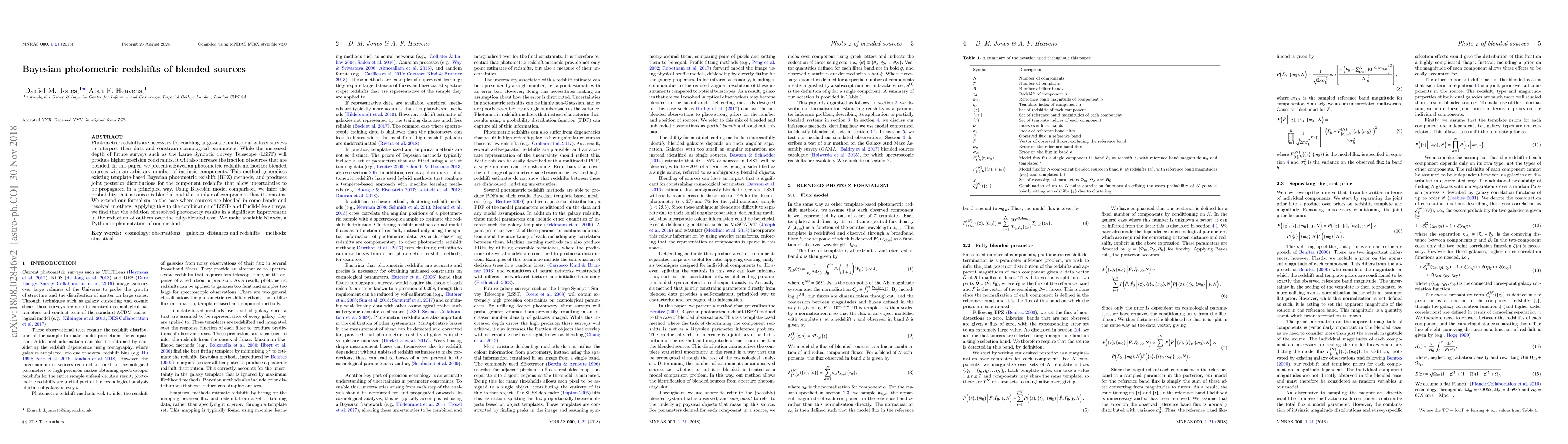Photometric redshifts are necessary for enabling large-scale multicolour galaxy surveys to interpret their data and constrain cosmological parameters. While the increased depth of future surveys such as the Large Synoptic Survey Telescope (LSST) will produce higher precision constraints, it will also increase the fraction of sources that are blended. In this paper, we present a Bayesian photometric redshift method for blended sources with an arbitrary number of intrinsic components. This method generalises existing template-based Bayesian photometric redshift (BPZ) methods, and produces joint posterior distributions for the component redshifts that allow uncertainties to be propagated in a principled way. Using Bayesian model comparison, we infer the probability that a source is blended and the number of components that it contains. We extend our formalism to the case where sources are blended in some bands and resolved in others. Applying this to the combination of LSST- and Euclid-like surveys, we find that the addition of resolved photometry results in a significant improvement in the reduction of outliers over the fully-blended case. We make available blendz, a Python implementation of our method.