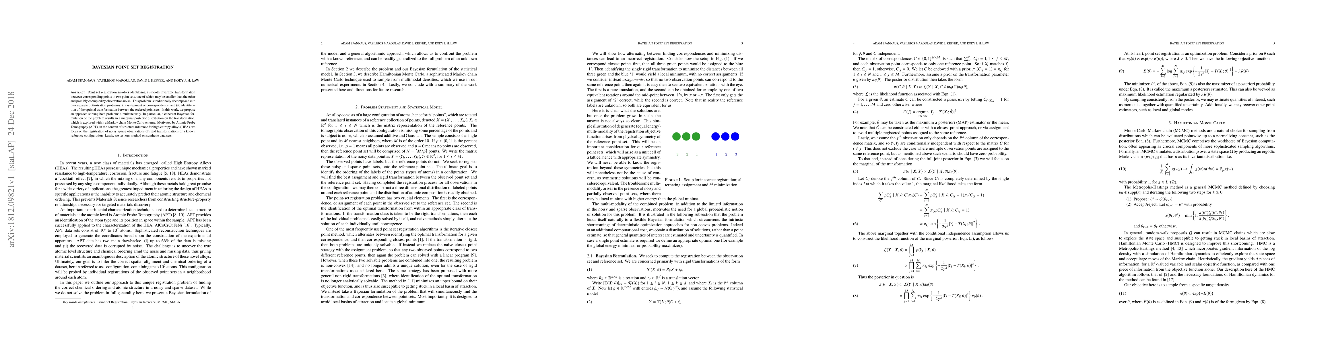 Point set registration involves identifying a smooth invertible transformation between corresponding points in two point sets, one of which may be smaller than the other and possibly corrupted by observation noise. This problem is traditionally decomposed into two separate optimization problems: (i) assignment or correspondence, and (ii) identification of the optimal transformation between the ordered point sets. In this work, we propose an approach solving both problems simultaneously. In particular, a coherent Bayesian formulation of the problem results in a marginal posterior distribution on the transformation, which is explored within a Markov chain Monte Carlo scheme. Motivated by Atomic Probe Tomography (APT), in the context of structure inference for high entropy alloys (HEA), we focus on the registration of noisy sparse observations of rigid transformations of a known reference configuration.Lastly, we test our method on synthetic data sets.