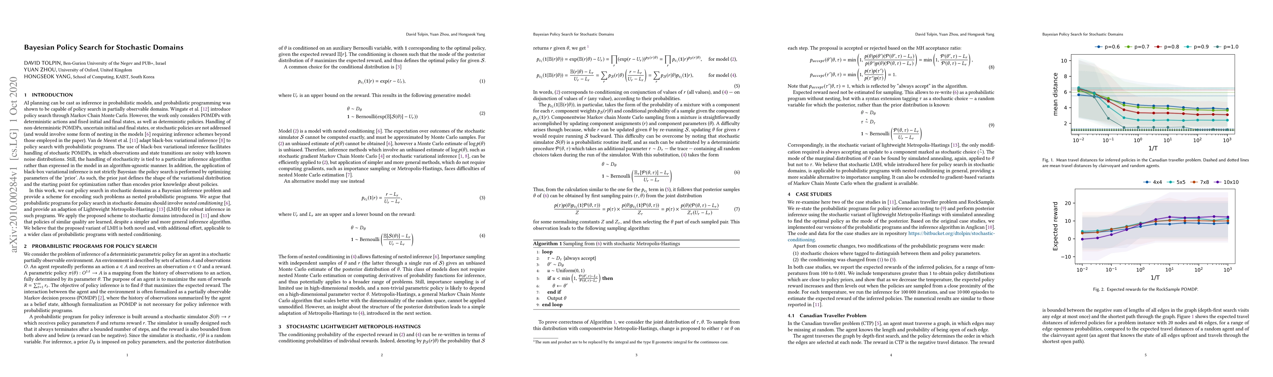 This paper proposes a Bayesian policy search framework for stochastic domains, framing the problem as a Bayesian inference issue. It introduces a novel adaptation of Lightweight Metropolis-Hastings (LMH) for robust inference in nested probabilistic programs, demonstrating comparable policy quality with a simpler and more general approach.