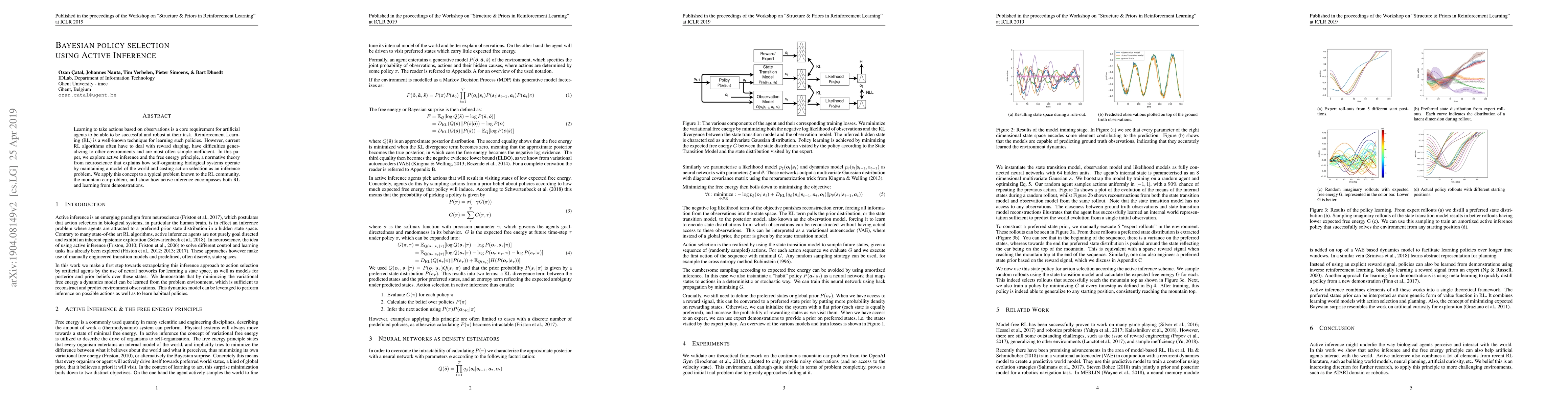 Learning to take actions based on observations is a core requirement for artificial agents to be able to be successful and robust at their task. Reinforcement Learning (RL) is a well-known technique for learning such policies. However, current RL algorithms often have to deal with reward shaping, have difficulties generalizing to other environments and are most often sample inefficient. In this paper, we explore active inference and the free energy principle, a normative theory from neuroscience that explains how self-organizing biological systems operate by maintaining a model of the world and casting action selection as an inference problem. We apply this concept to a typical problem known to the RL community, the mountain car problem, and show how active inference encompasses both RL and learning from demonstrations.