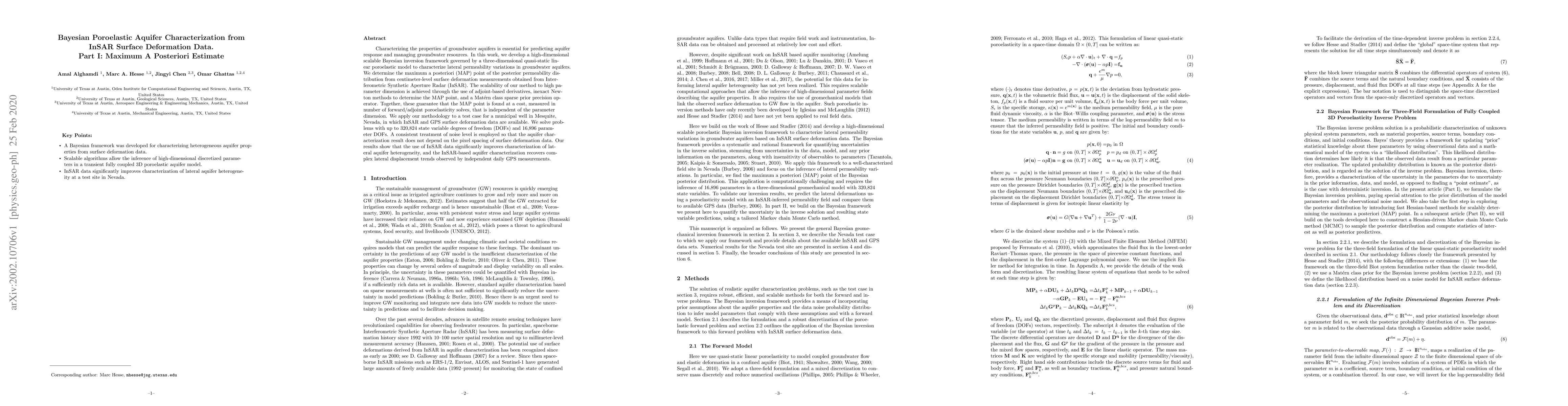 This paper develops a scalable Bayesian inversion framework for characterizing groundwater aquifers using InSAR surface deformation data. The method determines the maximum a posteriori (MAP) estimate of permeability distribution, achieving high-dimensional scalability through adjoint-based derivatives and inexact Newton methods, and is applied to a Mesquite, Nevada test case.