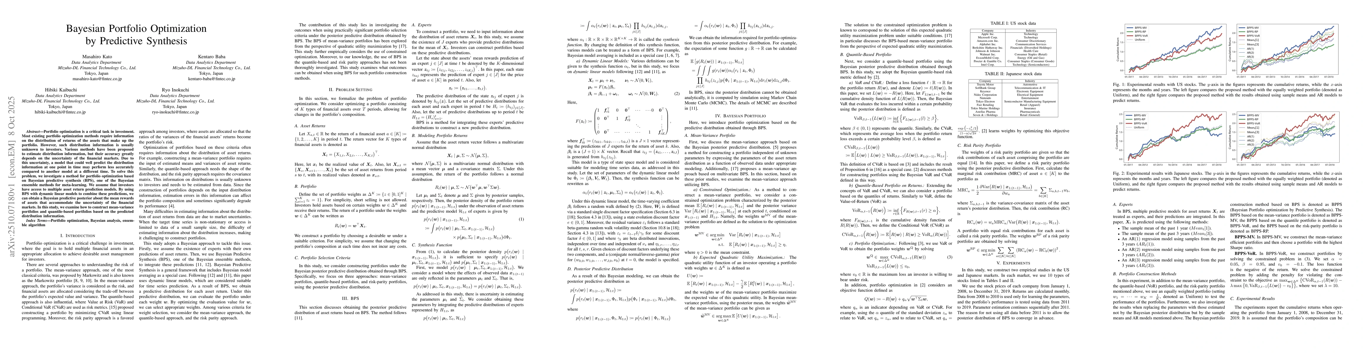 The paper proposes Bayesian Portfolio Optimization using Predictive Synthesis (BPS), integrating multiple asset return prediction models with dynamic linear models to construct a Bayesian predictive posterior distribution for portfolio returns.
