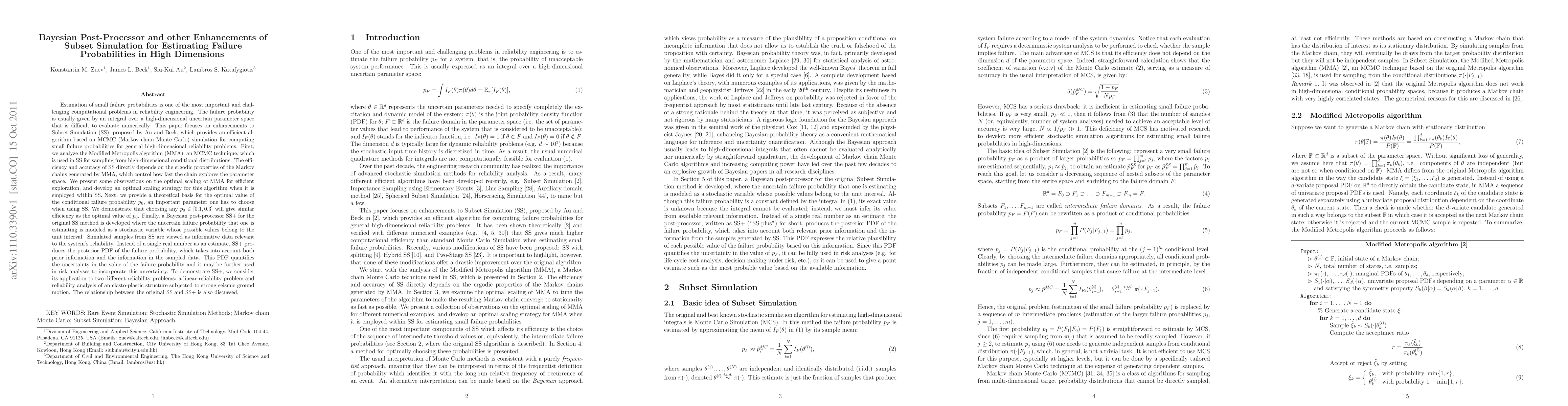 The paper presents an optimal scaling strategy for the Modified Metropolis algorithm used within Subset Simulation, a theoretical basis for the optimal value of the conditional failure probability p0, and a Bayesian post-processor (SS+) that provides a posterior PDF of the failure probability, incorporating both prior information and sampled data.