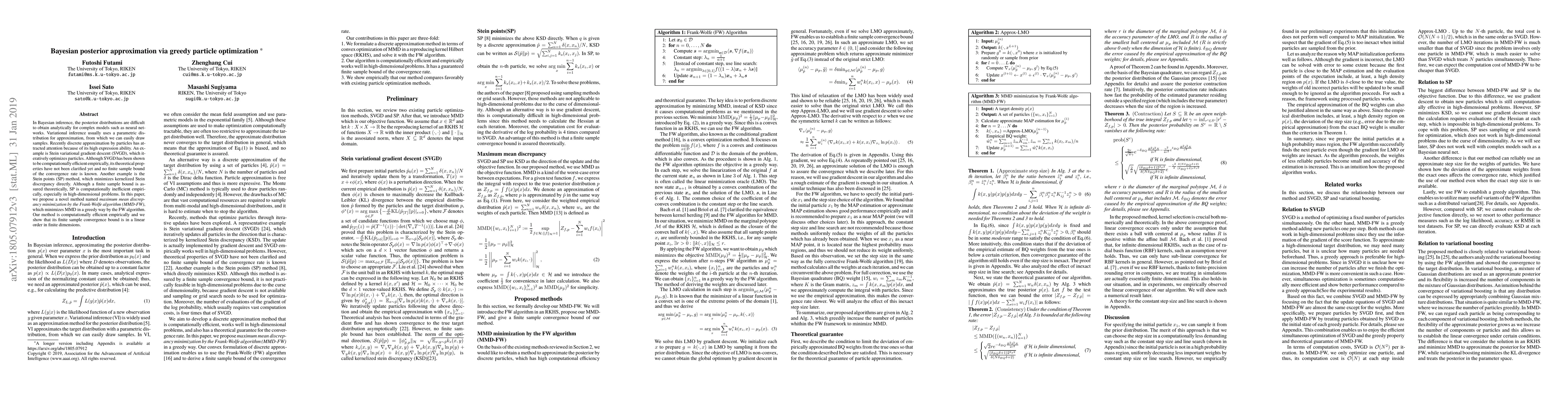 This paper proposes a new method for Bayesian posterior approximation via greedy particle optimization, which combines the efficiency of discrete approximation with the scalability of parametric distributions. It achieves computational efficiency and demonstrates a linear order convergence bound in finite dimensions.