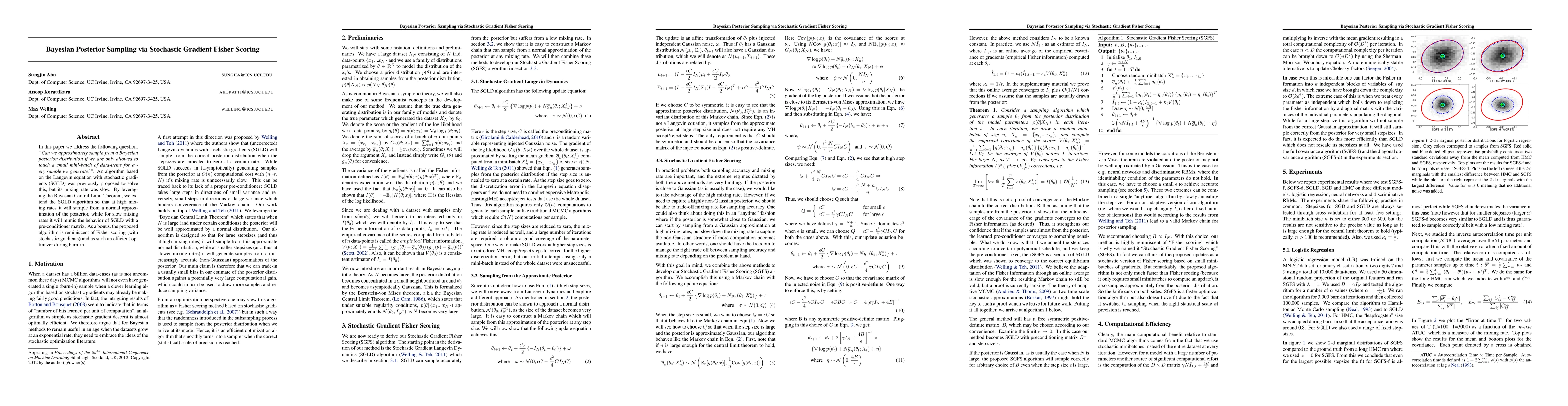 This paper proposes an improved algorithm for Bayesian posterior sampling using stochastic gradient Fisher scoring, which enhances the Langevin equation approach by leveraging the Bayesian Central Limit Theorem to achieve faster mixing rates and efficient optimization during burn-in. The method adapts to both high and low mixing rates, offering a robust solution for sampling from posterior distributions with limited data access.