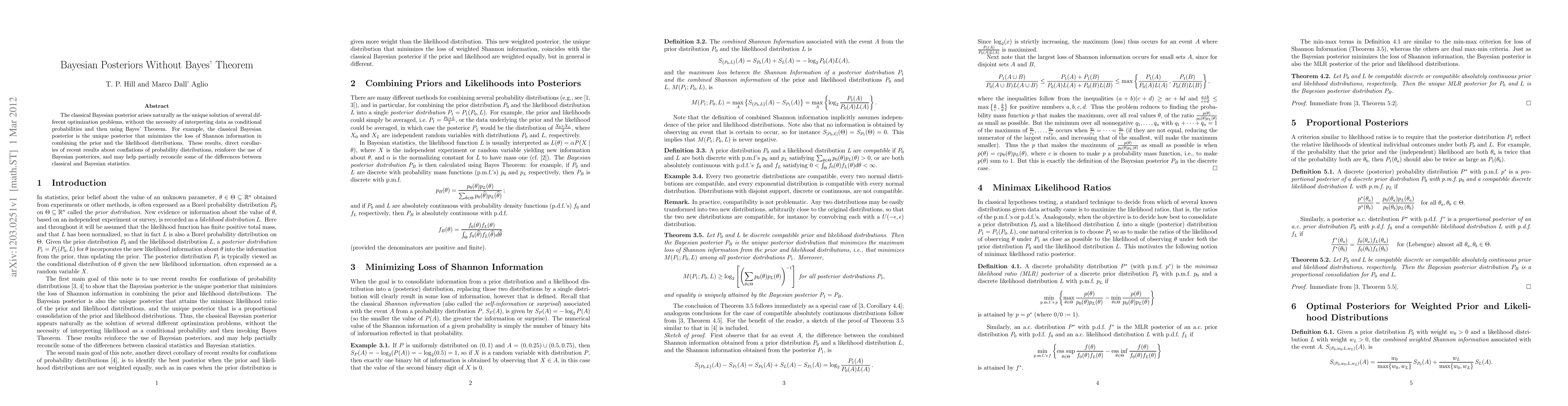 The classical Bayesian posterior arises naturally as the unique solution of several different optimization problems, without the necessity of interpreting data as conditional probabilities and then using Bayes' Theorem. For example, the classical Bayesian posterior is the unique posterior that minimizes the loss of Shannon information in combining the prior and the likelihood distributions. These results, direct corollaries of recent results about conflations of probability distributions, reinforce the use of Bayesian posteriors, and may help partially reconcile some of the differences between classical and Bayesian statistics.