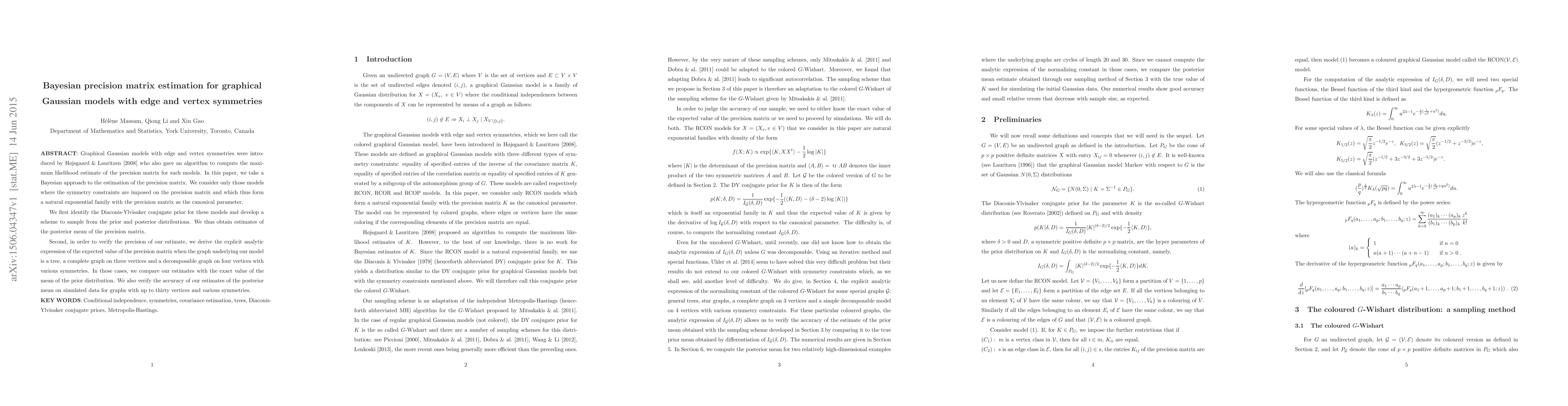 This paper proposes a Bayesian method for estimating the precision matrix in graphical Gaussian models with edge and vertex symmetries. It identifies a conjugate prior and develops a sampling scheme to obtain posterior mean estimates, which are verified against exact values for specific graph structures and simulated data.