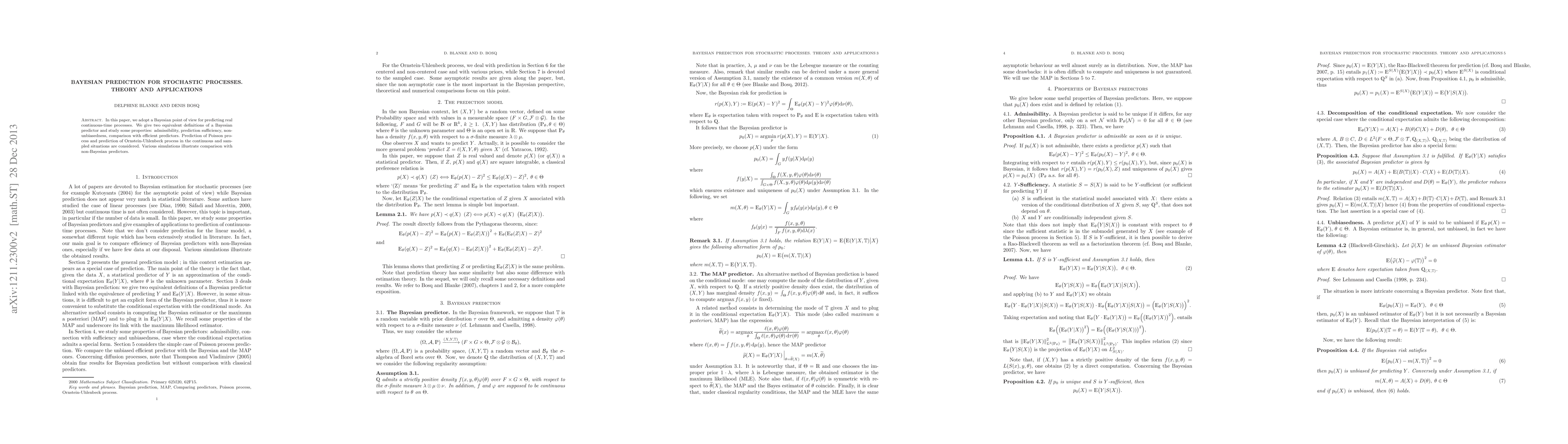 This paper develops Bayesian methods for predicting continuous-time stochastic processes, comparing Bayesian predictors with non-Bayesian ones through simulations. It examines properties like admissibility and non-unbiasedness, and applies the theory to Poisson and Ornstein-Uhlenbeck processes.