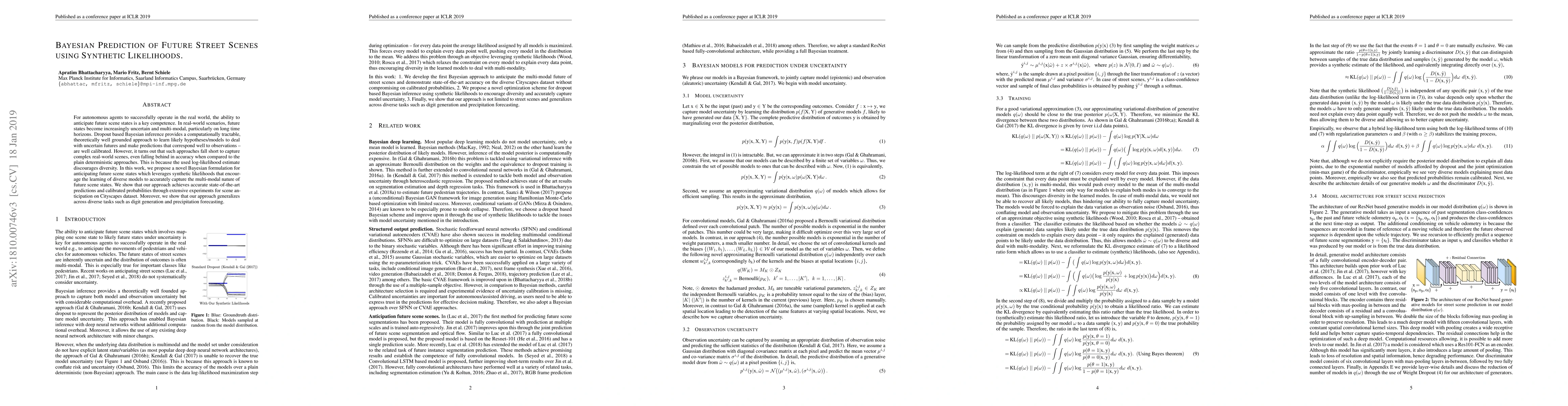 For autonomous agents to successfully operate in the real world, the ability to anticipate future scene states is a key competence. In real-world scenarios, future states become increasingly uncertain and multi-modal, particularly on long time horizons. Dropout based Bayesian inference provides a computationally tractable, theoretically well grounded approach to learn likely hypotheses/models to deal with uncertain futures and make predictions that correspond well to observations -- are well calibrated. However, it turns out that such approaches fall short to capture complex real-world scenes, even falling behind in accuracy when compared to the plain deterministic approaches. This is because the used log-likelihood estimate discourages diversity. In this work, we propose a novel Bayesian formulation for anticipating future scene states which leverages synthetic likelihoods that encourage the learning of diverse models to accurately capture the multi-modal nature of future scene states. We show that our approach achieves accurate state-of-the-art predictions and calibrated probabilities through extensive experiments for scene anticipation on Cityscapes dataset. Moreover, we show that our approach generalizes across diverse tasks such as digit generation and precipitation forecasting.