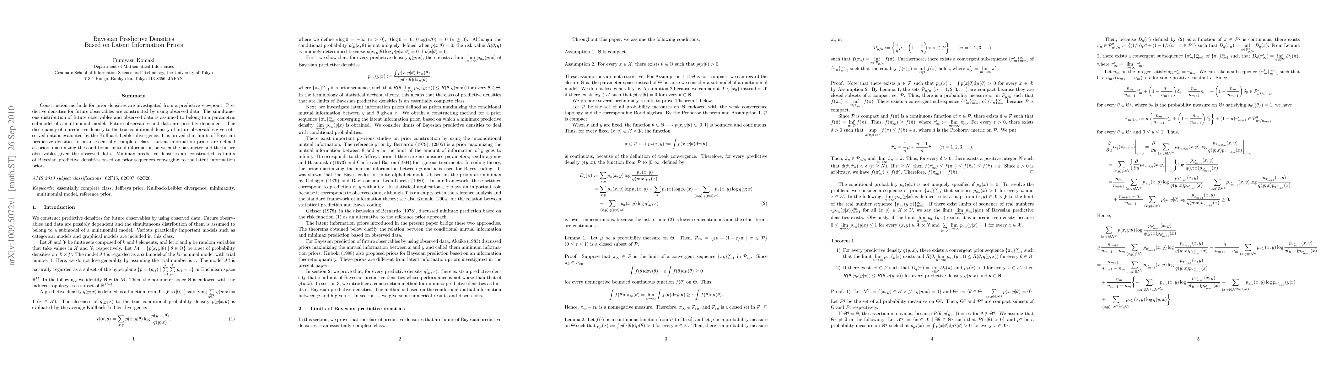 This paper investigates construction methods for prior densities from a predictive viewpoint, focusing on Bayesian predictive densities based on latent information priors. The authors prove that limits of these Bayesian predictive densities form an essentially complete class and construct minimax predictive densities based on prior sequences converging to latent information priors.