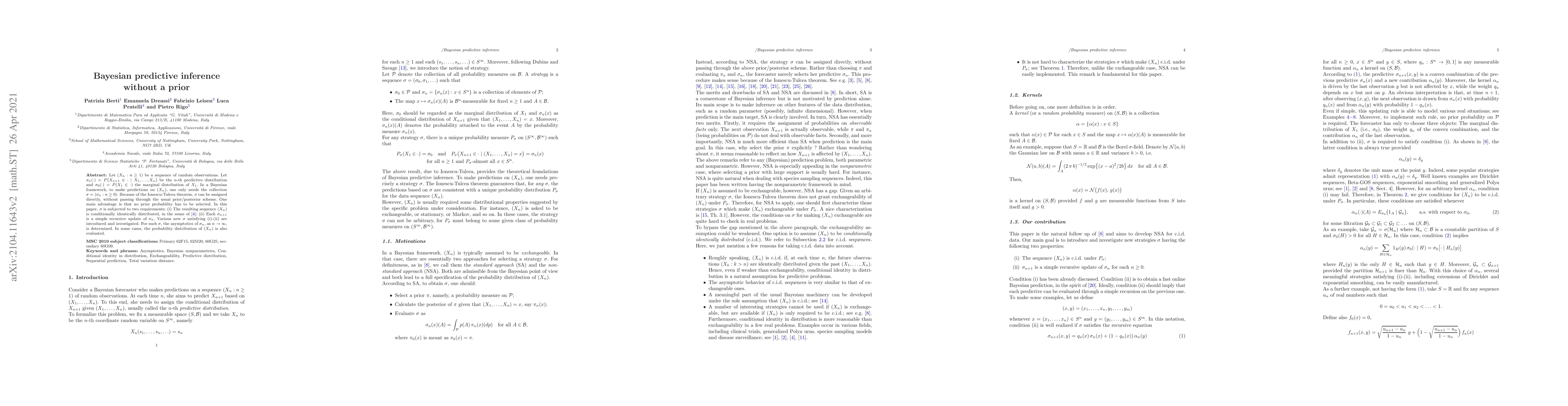 This paper proposes a new method for Bayesian predictive inference without needing to select a prior probability, allowing for simpler and more flexible prediction models. It introduces various conditions and constraints on the sequence of predictive distributions that ensure consistency and asymptotic behavior.