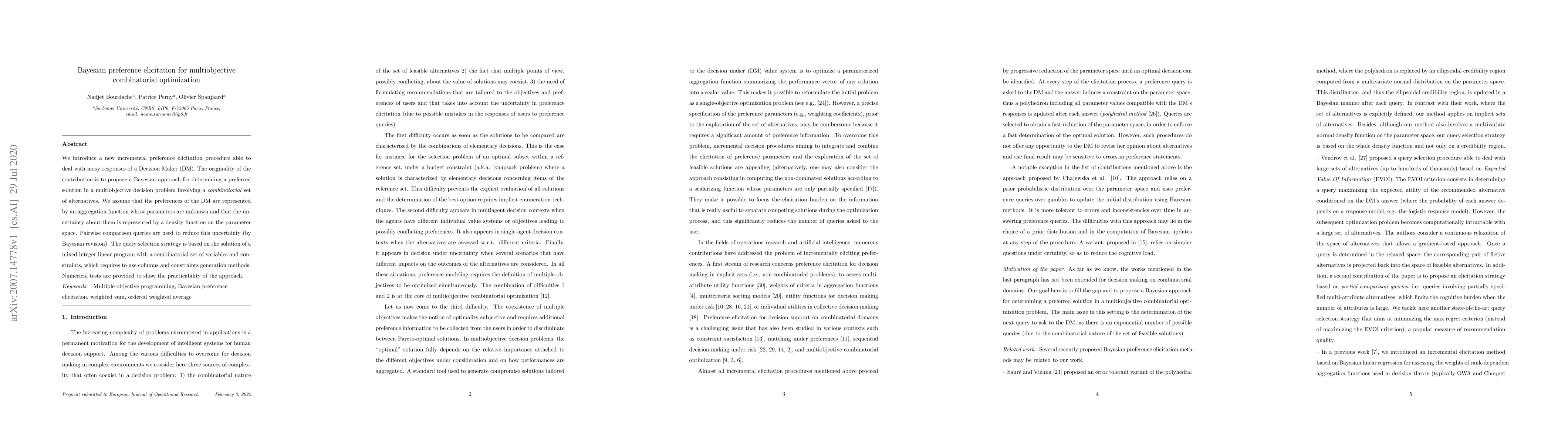 We introduce a new incremental preference elicitation procedure able to deal with noisy responses of a Decision Maker (DM). The originality of the contribution is to propose a Bayesian approach for determining a preferred solution in a multiobjective decision problem involving a combinatorial set of alternatives. We assume that the preferences of the DM are represented by an aggregation function whose parameters are unknown and that the uncertainty about them is represented by a density function on the parameter space. Pairwise comparison queries are used to reduce this uncertainty (by Bayesian revision). The query selection strategy is based on the solution of a mixed integer linear program with a combinatorial set of variables and constraints, which requires to use columns and constraints generation methods. Numerical tests are provided to show the practicability of the approach.