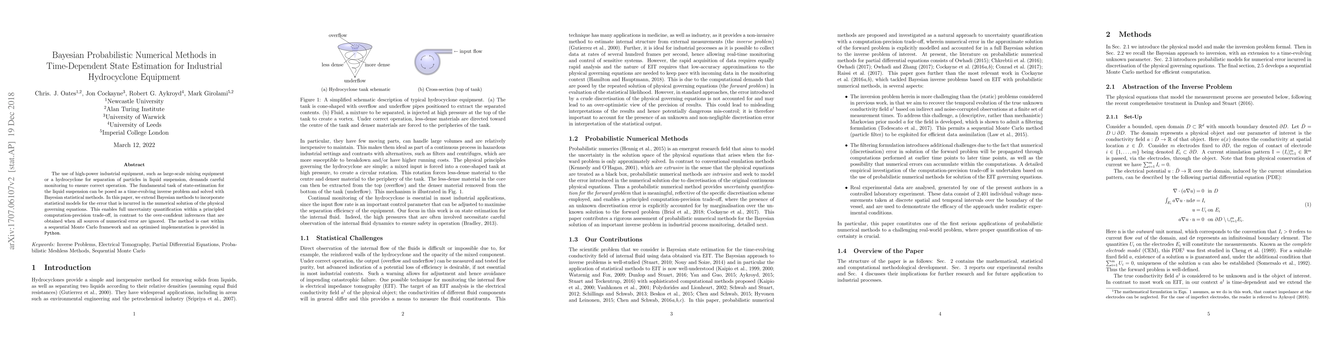 This paper develops Bayesian probabilistic numerical methods for time-dependent state estimation in industrial hydrocyclones, incorporating statistical models for numerical errors to achieve full uncertainty quantification. The method is implemented using a sequential Monte Carlo framework in Python.