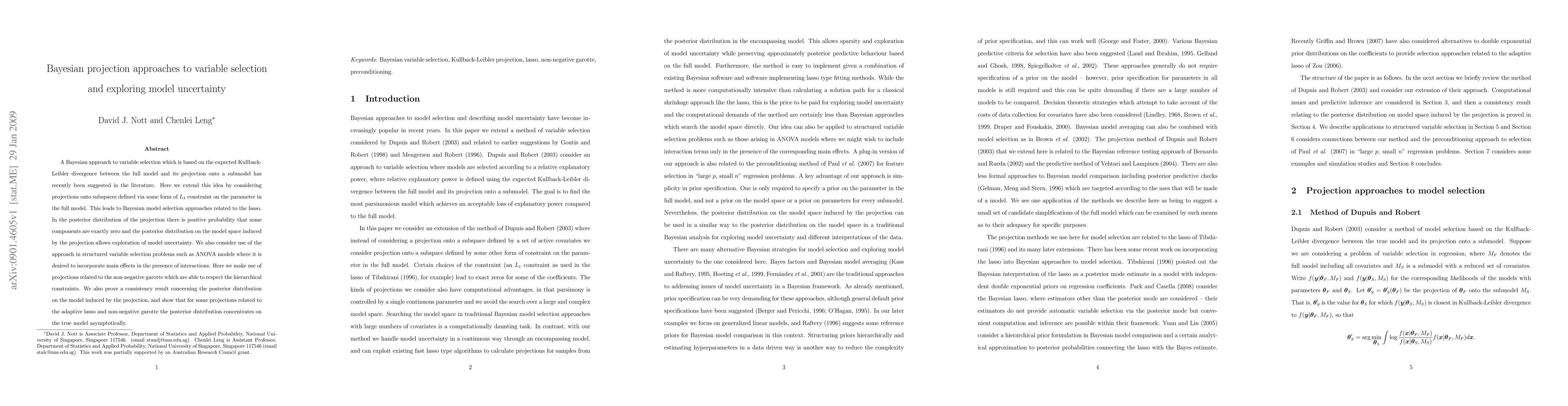 A Bayesian approach to variable selection which is based on the expected Kullback-Leibler divergence between the full model and its projection onto a submodel has recently been suggested in the literature. Here we extend this idea by considering projections onto subspaces defined via some form of $L_1$ constraint on the parameter in the full model. This leads to Bayesian model selection approaches related to the lasso. In the posterior distribution of the projection there is positive probability that some components are exactly zero and the posterior distribution on the model space induced by the projection allows exploration of model uncertainty. We also consider use of the approach in structured variable selection problems such as ANOVA models where it is desired to incorporate main effects in the presence of interactions. Here we make use of projections related to the non-negative garotte which are able to respect the hierarchical constraints. We also prove a consistency result concerning the posterior distribution on the model induced by the projection, and show that for some projections related to the adaptive lasso and non-negative garotte the posterior distribution concentrates on the true model asymptotically.