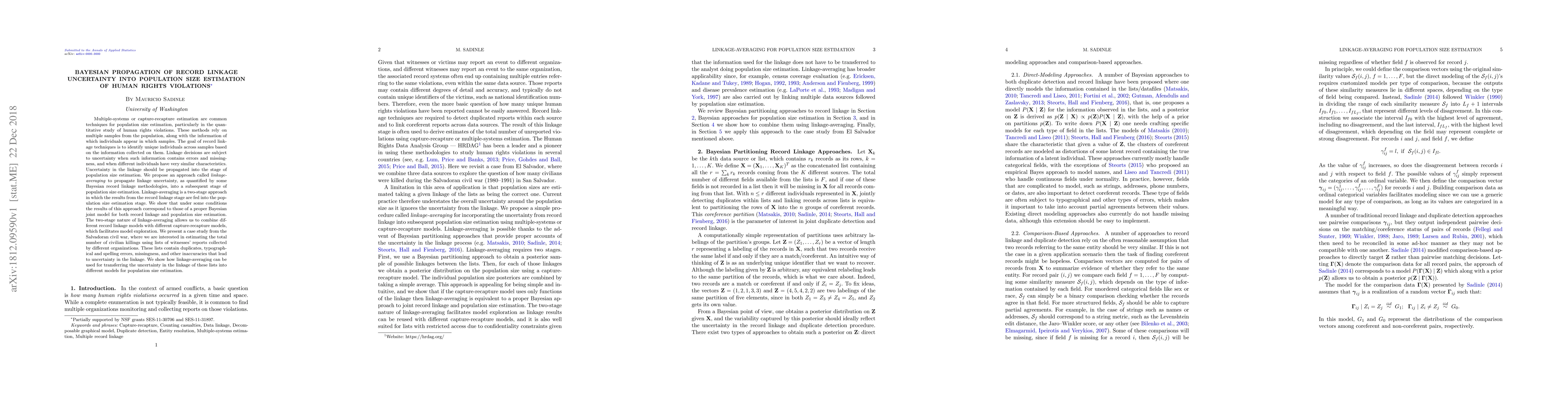 This paper proposes a linkage-averaging approach to propagate uncertainty from record linkage into population size estimation, particularly in studying human rights violations. It demonstrates how Bayesian record linkage uncertainty can be integrated into capture-recapture methods, using a case study from the Salvadoran civil war to estimate civilian killings.