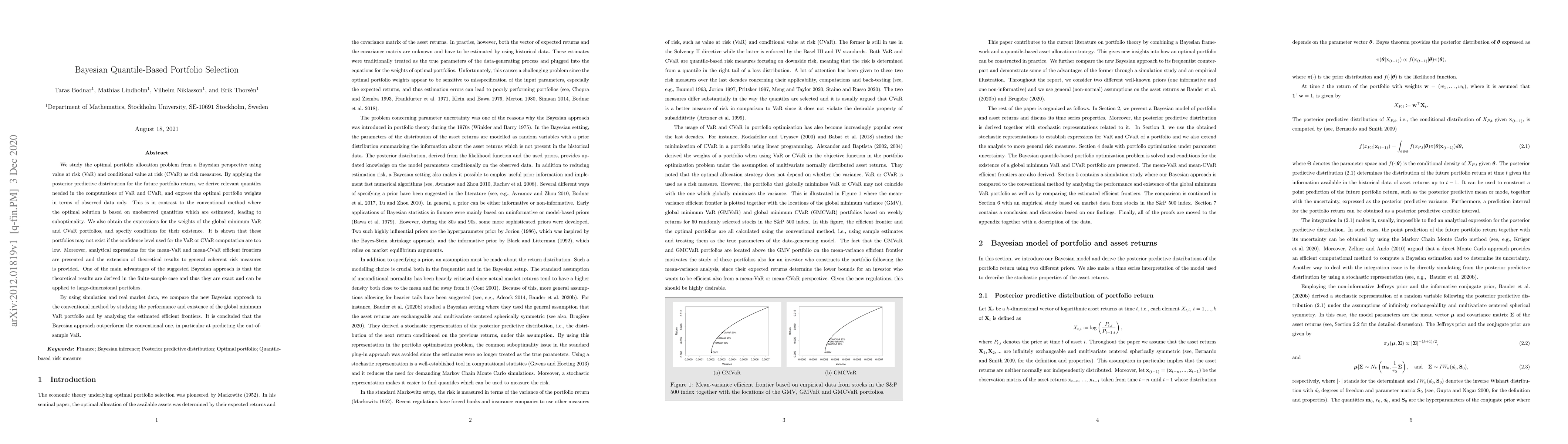This paper proposes a Bayesian method for portfolio selection using VaR and CVaR as risk measures, deriving optimal portfolio weights based on observed data rather than estimated unobserved quantities. The study finds that the Bayesian approach outperforms traditional methods, particularly in predicting out-of-sample VaR, and provides exact results applicable to large-dimensional portfolios.