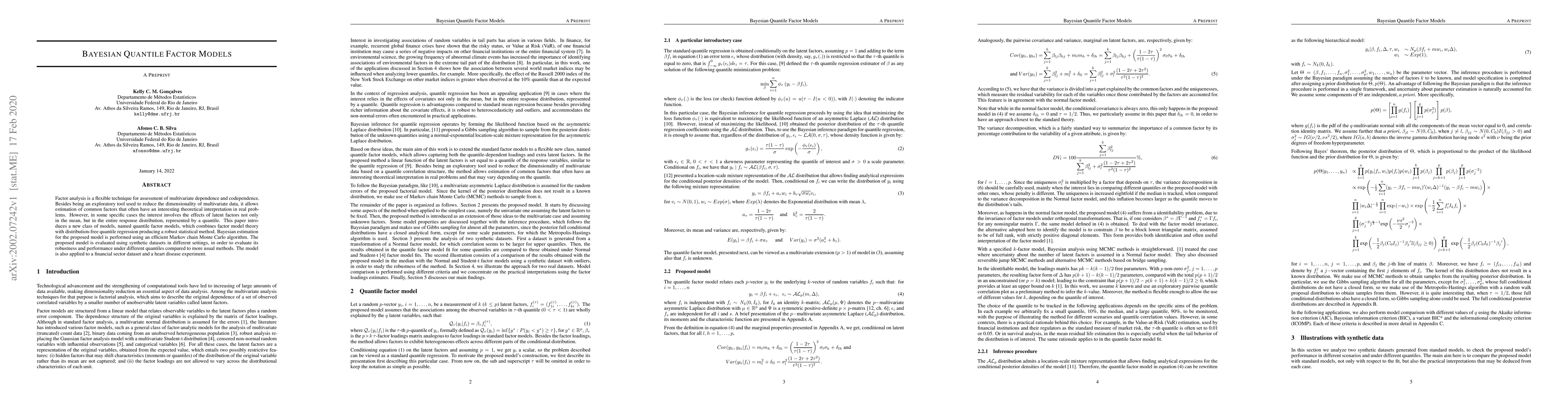 This paper introduces quantile factor models that combine factor analysis with quantile regression to estimate the effects of latent factors on the entire response distribution. The Bayesian estimation is performed using Markov chain Monte Carlo, and the model's robustness and performance are evaluated through synthetic datasets and real-world applications in finance and healthcare.