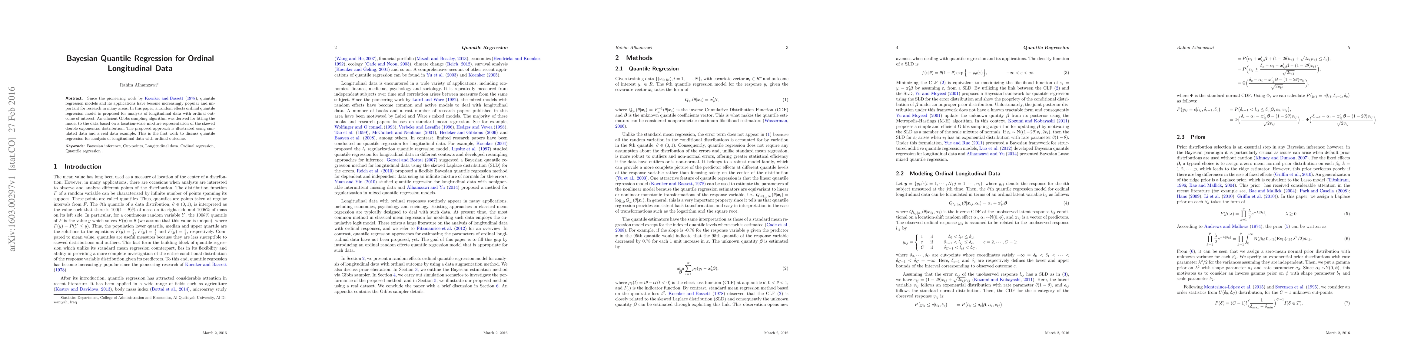 This paper proposes a novel Bayesian random effects ordinal quantile regression model for analyzing longitudinal data with ordinal outcomes, employing an efficient Gibbs sampling algorithm based on a skewed double exponential distribution. The method is demonstrated through simulated and real data examples, marking the first application of quantile regression to such data.