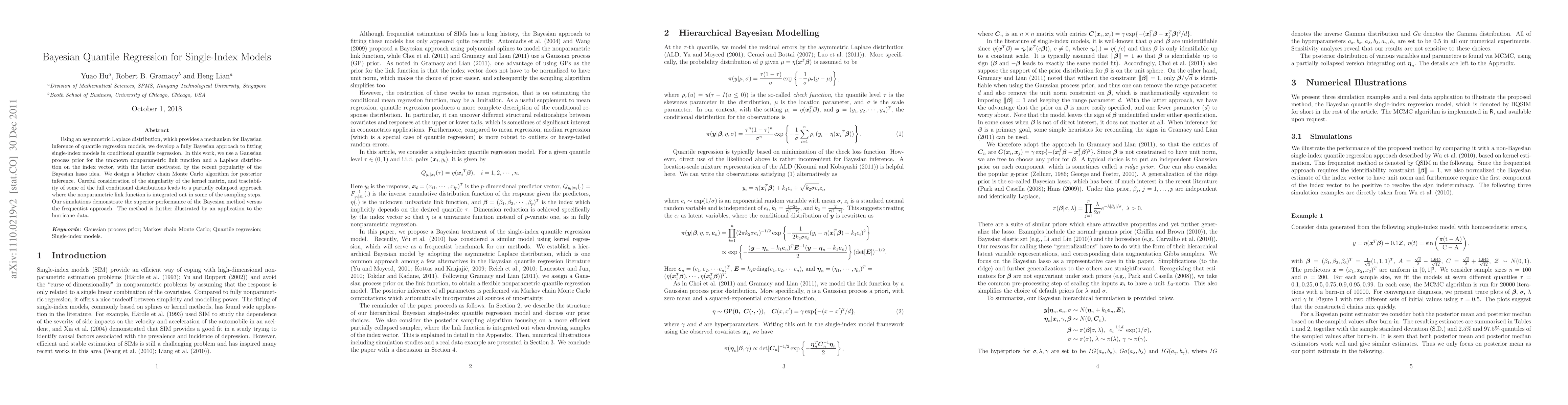 This paper develops a Bayesian quantile regression method for single-index models, employing an asymmetric Laplace distribution for inference. It uses a Gaussian process prior and a Markov chain Monte Carlo algorithm, showcasing superior performance over frequentist methods through simulations and an application to hurricane data.