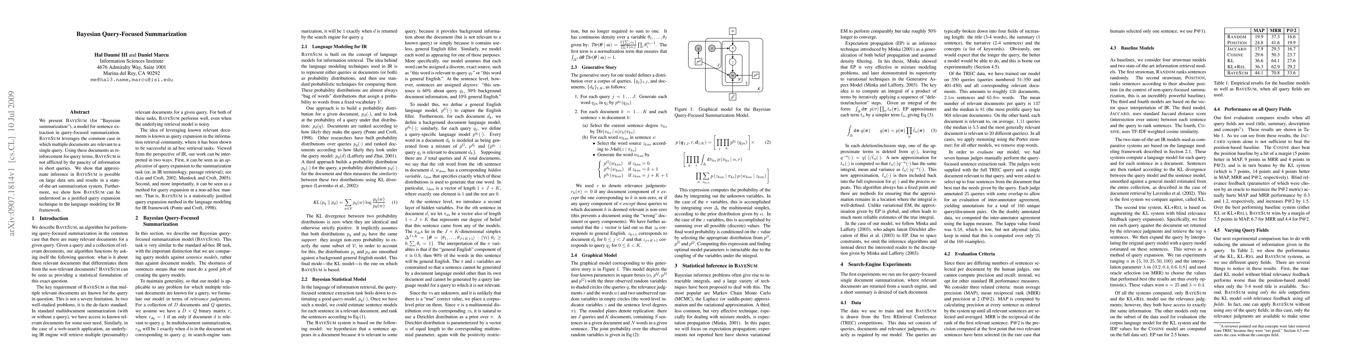 The paper introduces BayeSum, a Bayesian query-focused summarization model that uses expectation propagation for tractable statistical inference, demonstrating state-of-the-art performance in summarization tasks.