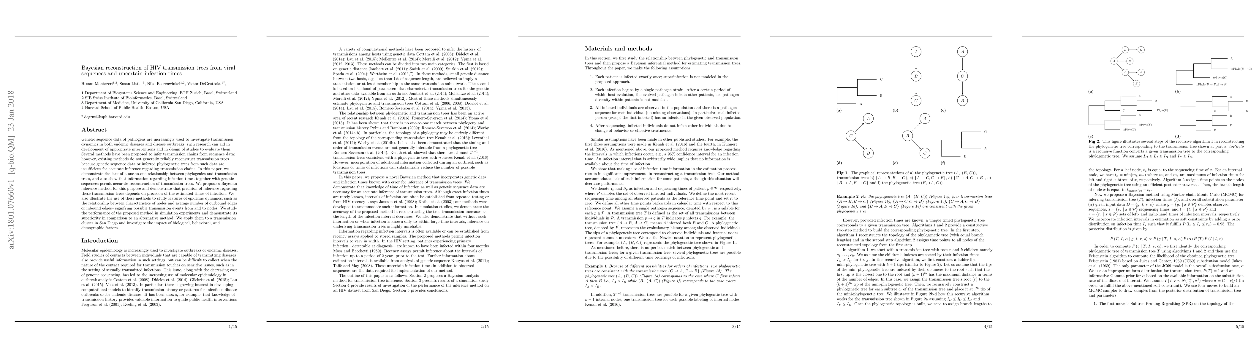 This paper presents a Bayesian method to reconstruct HIV transmission trees using viral sequences and uncertain infection times, demonstrating that combining genetic data with timing information improves accuracy. The study also explores the impact of various factors on transmission dynamics through a San Diego case study, outperforming alternative methods in simulation experiments.