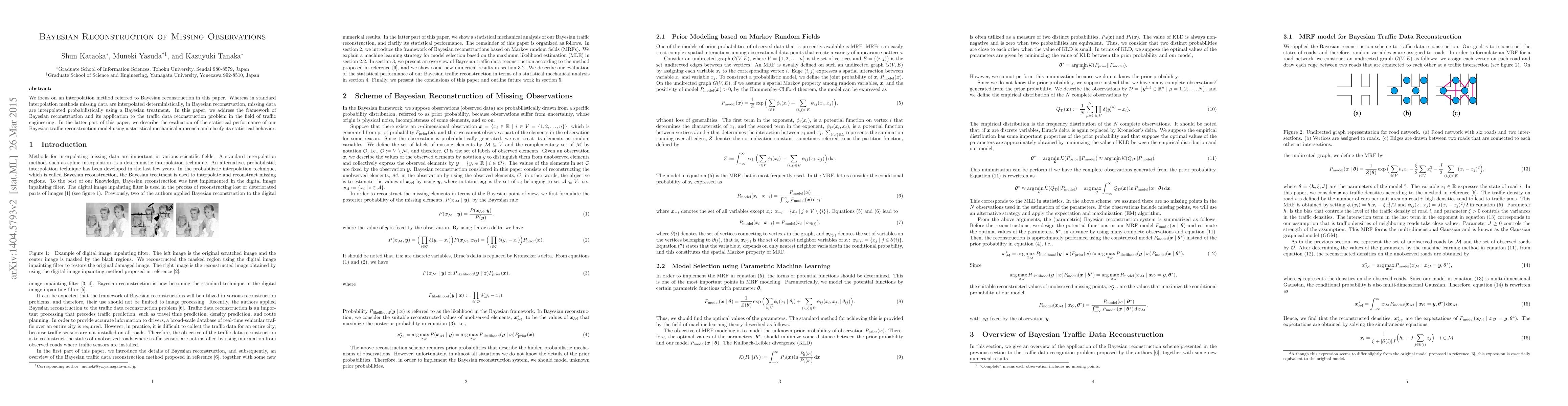 We focus on an interpolation method referred to Bayesian reconstruction in this paper. Whereas in standard interpolation methods missing data are interpolated deterministically, in Bayesian reconstruction, missing data are interpolated probabilistically using a Bayesian treatment. In this paper, we address the framework of Bayesian reconstruction and its application to the traffic data reconstruction problem in the field of traffic engineering. In the latter part of this paper, we describe the evaluation of the statistical performance of our Bayesian traffic reconstruction model using a statistical mechanical approach and clarify its statistical behavior.