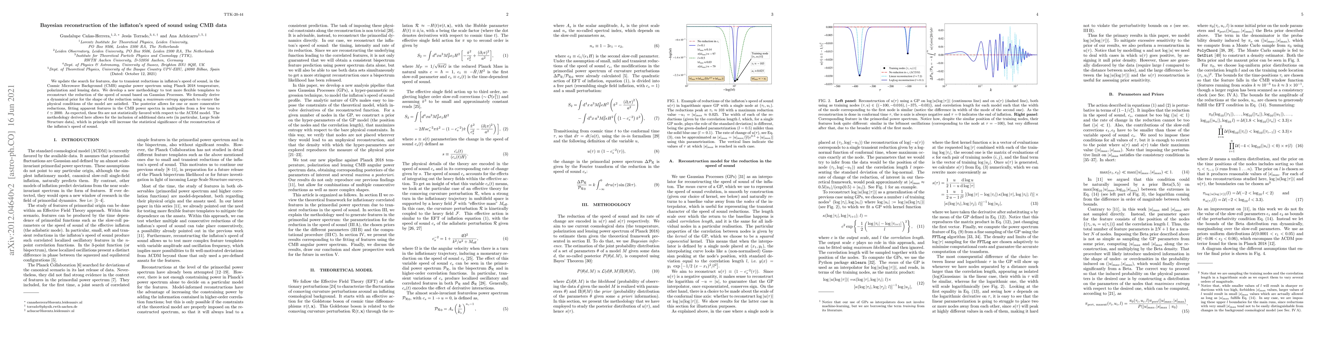 We update the search for features, due to transient reductions in inflaton's speed of sound, in the Cosmic Microwave Background (CMB) angular power spectrum using Planck 2018 temperature, polarization and lensing data. We develop a new methodology to test more flexible templates to reconstruct the reduction of the speed of sound based on Gaussian Processes. We formally derive a dynamical prior for the shape of the reduction using a \textit{maximum-entropy} approach to ensure the physical conditions of the model are satisfied. The posterior allows for one or more consecutive reductions, fitting apparent features in the CMB power spectra in multipoles from a few tens to $\ell\simeq 2000$. As expected, these fits are not statistically favored with respect to the $\Lambda$CDM model. The methodology derived here allows for the inclusion of additional data sets (in particular, Large Scale Structure data), which in principle will increase the statistical significance of the reconstruction of the inflaton's speed of sound.
