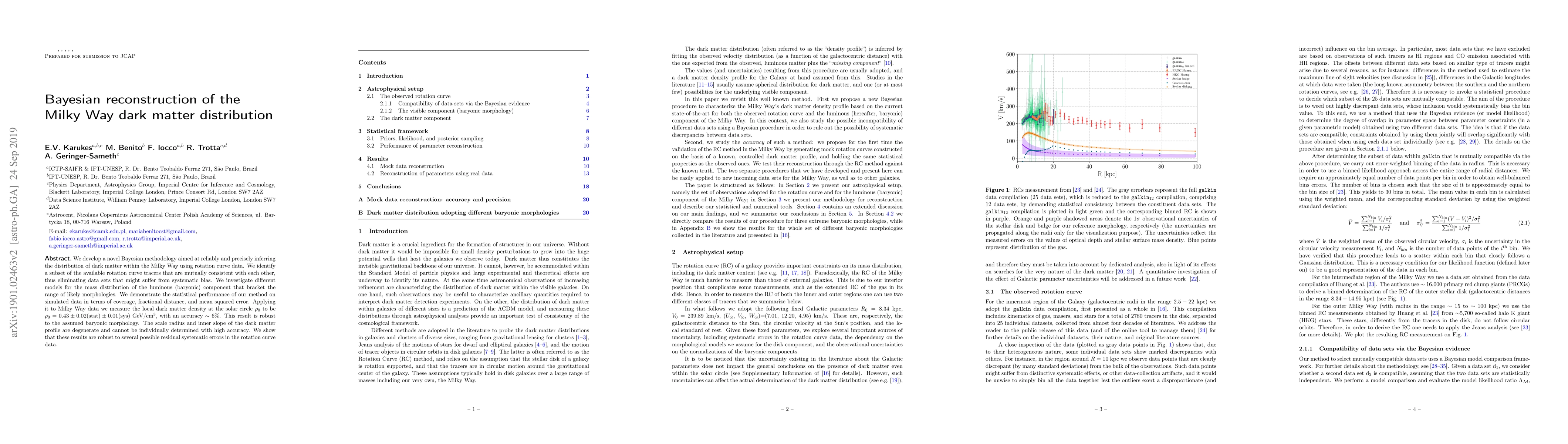 This paper introduces a Bayesian methodology to infer the Milky Way's dark matter distribution using rotation curve data, identifying consistent tracers and testing three baryonic morphology models. The method yields a local dark matter density of $\rho_0 = 0.43\pm 0.02(\rm{stat})\pm0.01(\rm{sys})$ GeV/cm$^3$ with 6% accuracy, demonstrating robustness against systematic errors.