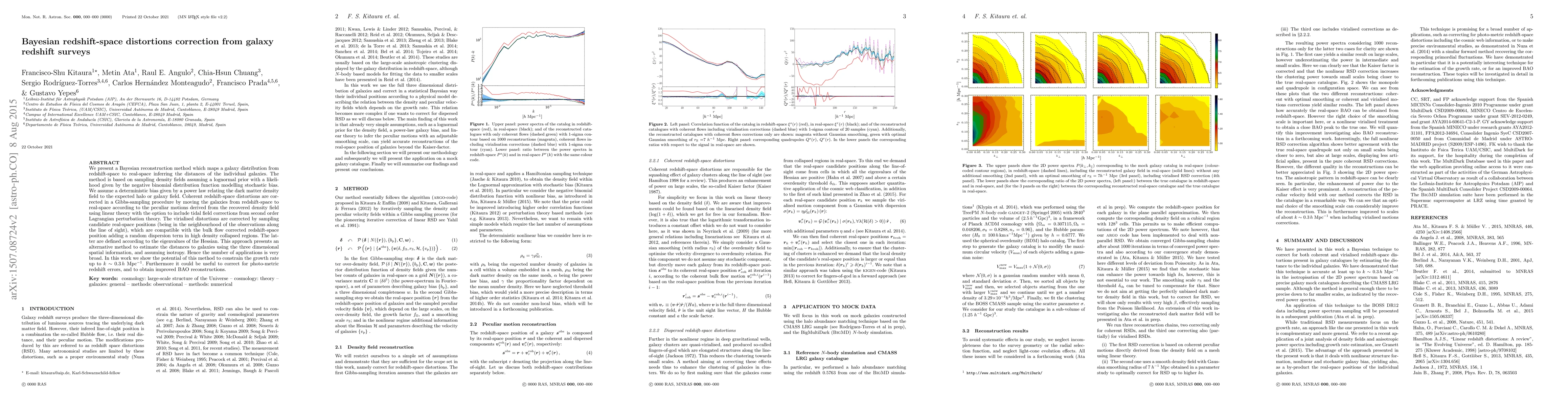 We present a Bayesian reconstruction method which maps a galaxy distribution from redshift-space to real-space inferring the distances of the individual galaxies. The method is based on sampling density fields assuming a lognormal prior with a likelihood given by the negative binomial distribution function modelling stochastic bias. We assume a deterministic bias given by a power law relating the dark matter density field to the expected halo or galaxy field. Coherent redshift-space distortions are corrected in a Gibbs-sampling procedure by moving the galaxies from redshift-space to real-space according to the peculiar motions derived from the recovered density field using linear theory with the option to include tidal field corrections from second order Lagrangian perturbation theory. The virialised distortions are corrected by sampling candidate real-space positions (being in the neighbourhood of the observations along the line of sight), which are compatible with the bulk flow corrected redshift-space position adding a random dispersion term in high density collapsed regions. The latter are defined according to the eigenvalues of the Hessian. This approach presents an alternative method to estimate the distances to galaxies using the three dimensional spatial information, and assuming isotropy. Hence the number of applications is very broad. In this work we show the potential of this method to constrain the growth rate up to $k$ ~ 0.3 $h$ Mpc$^{-1}$. Furthermore it could be useful to correct for photo-metric redshift errors, and to obtain improved BAO reconstructions.