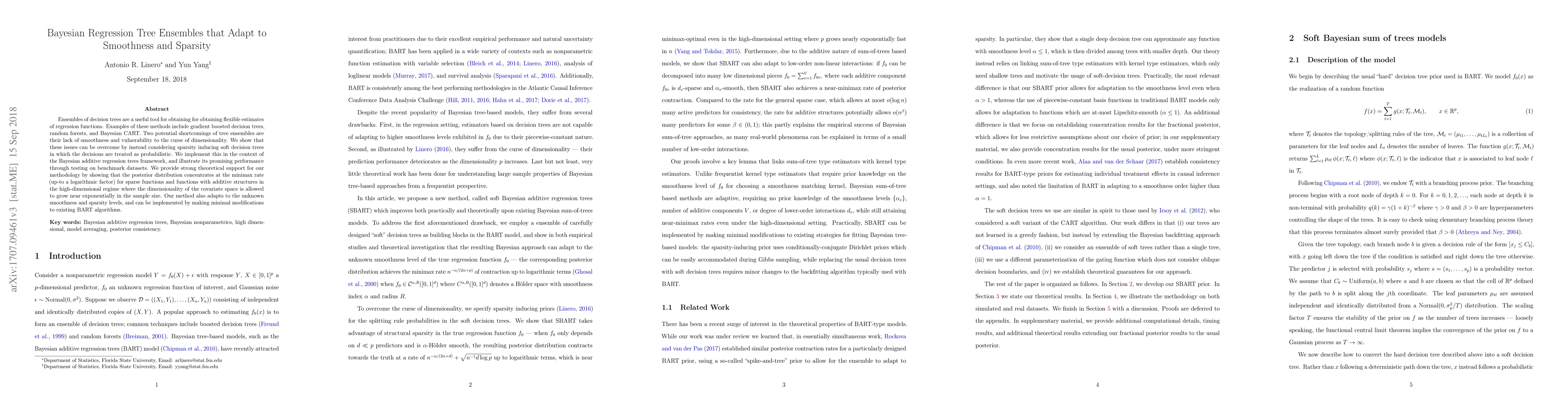 This paper proposes Bayesian regression tree ensembles that adapt to smoothness and sparsity by using sparsity-inducing soft decision trees. The method, implemented within the Bayesian additive regression trees framework, shows promising performance on benchmark datasets and adapts to unknown smoothness and sparsity levels, providing theoretical support for its minimax rate concentration in high-dimensional settings.