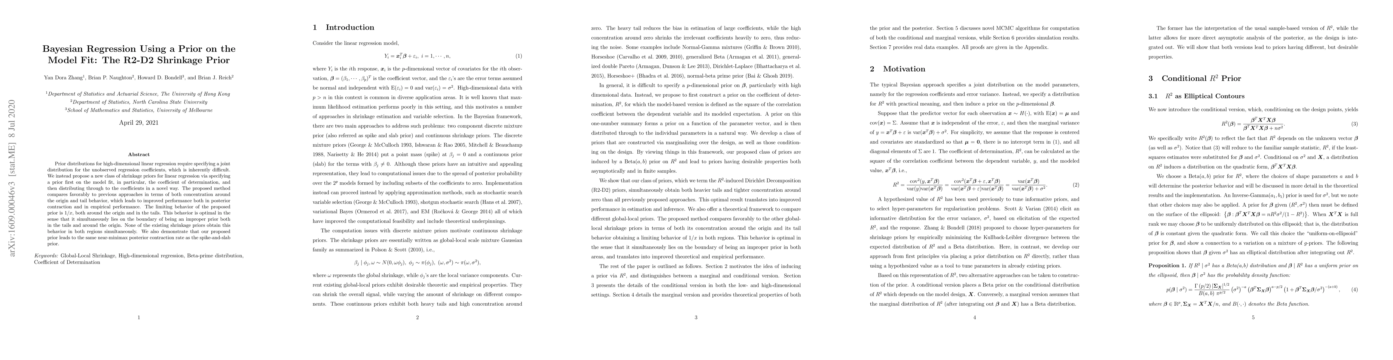 Prior distributions for high-dimensional linear regression require specifying a joint distribution for the unobserved regression coefficients, which is inherently difficult. We instead propose a new class of shrinkage priors for linear regression via specifying a prior first on the model fit, in particular, the coefficient of determination, and then distributing through to the coefficients in a novel way. The proposed method compares favourably to previous approaches in terms of both concentration around the origin and tail behavior, which leads to improved performance both in posterior contraction and in empirical performance. The limiting behavior of the proposed prior is $1/x$, both around the origin and in the tails. This behavior is optimal in the sense that it simultaneously lies on the boundary of being an improper prior both in the tails and around the origin. None of the existing shrinkage priors obtain this behavior in both regions simultaneously. We also demonstrate that our proposed prior leads to the same near-minimax posterior contraction rate as the spike-and-slab prior.