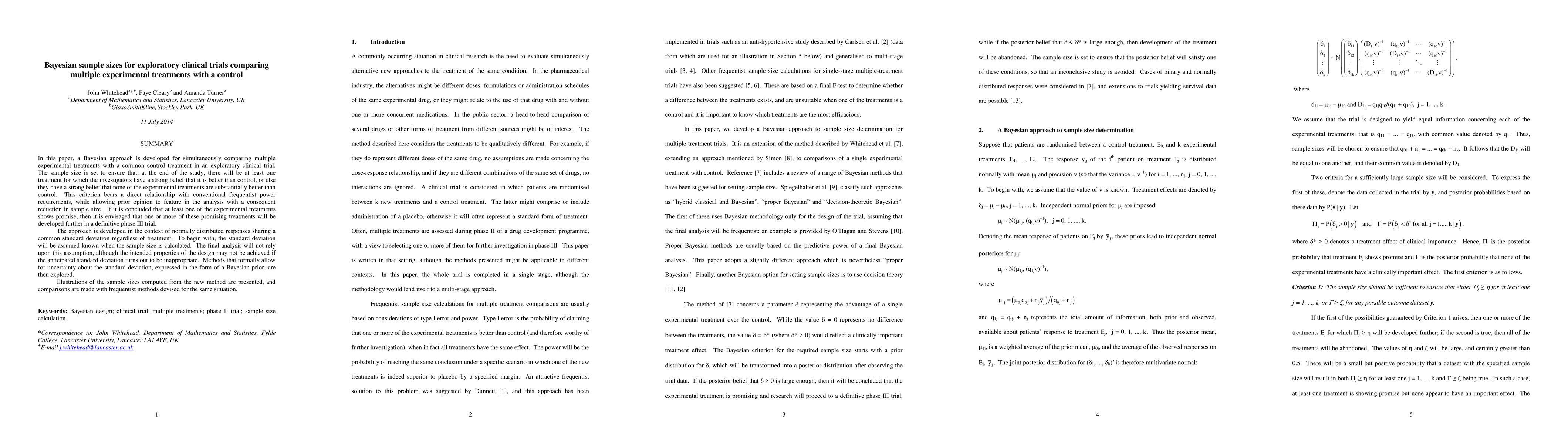 A Bayesian approach is developed to determine sample sizes for exploratory clinical trials comparing multiple treatments to a control, allowing prior opinion to inform the analysis and reducing required sample size.