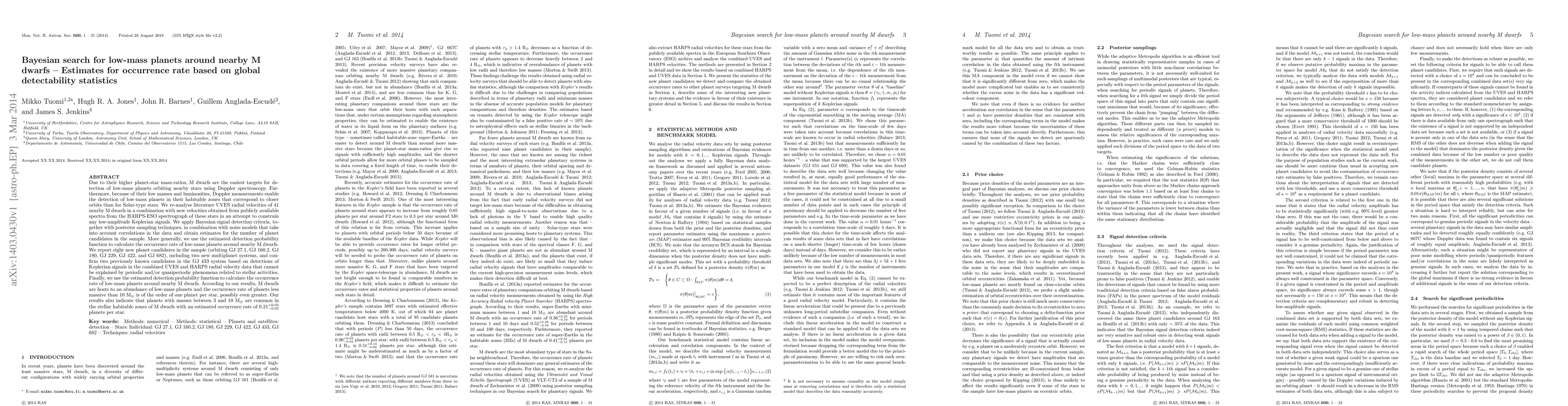 This paper uses Bayesian search techniques to detect low-mass planets around 41 nearby M dwarfs, finding eight new planet candidates and confirming two previously known candidates. The study estimates an occurrence rate of low-mass planets around M dwarfs, suggesting one planet per star, possibly even higher.