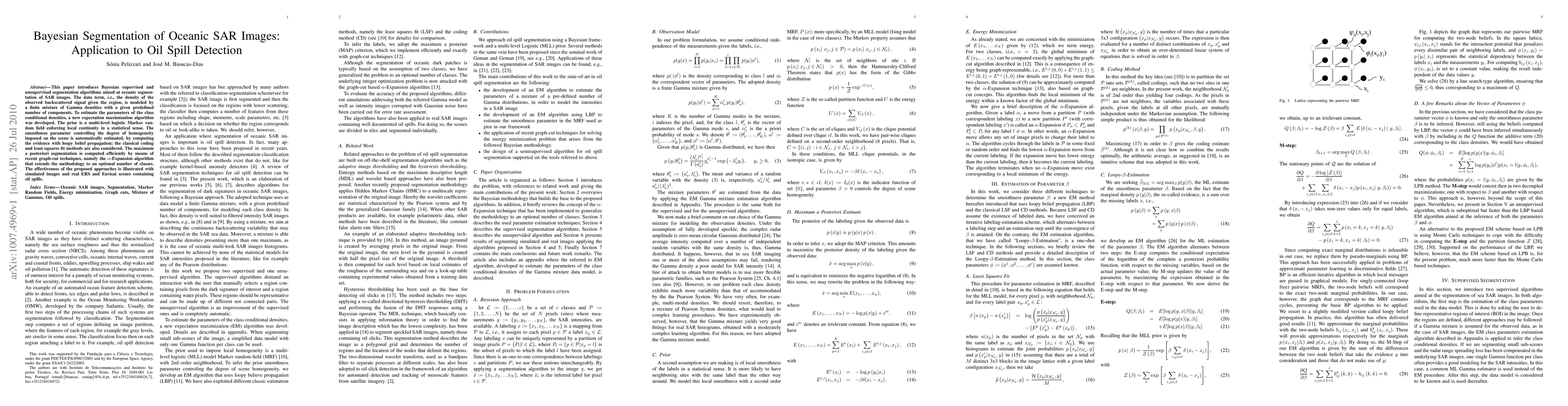 Researchers developed a new algorithm to detect oil spills in oceanic SAR images using Bayesian segmentation. The approach combines supervised and unsupervised techniques to accurately segment the image and identify areas affected by the spill.