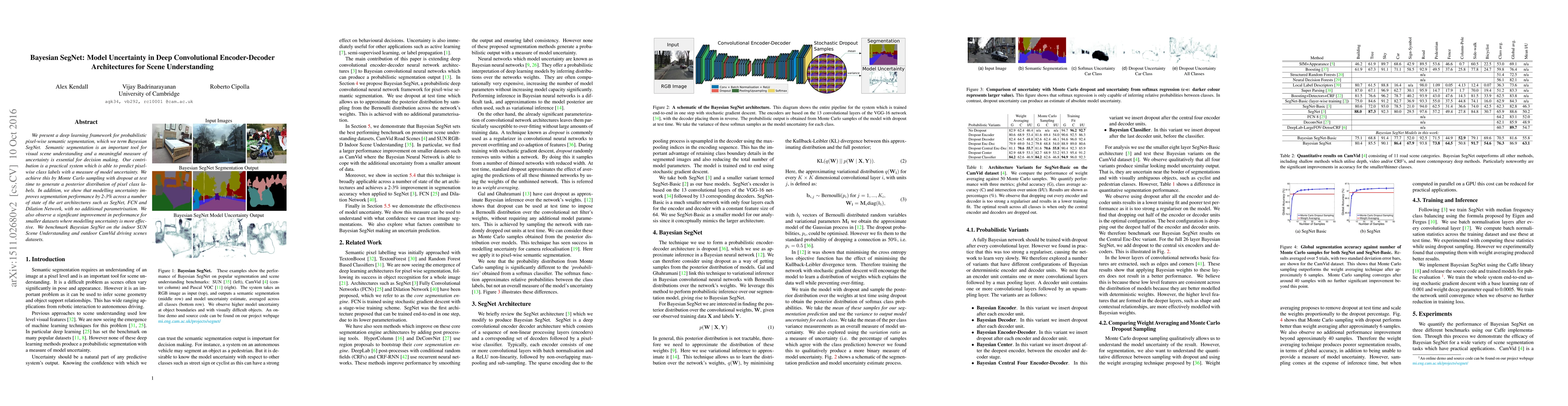 The paper introduces Bayesian SegNet, a probabilistic framework for semantic segmentation that incorporates model uncertainty through Monte Carlo sampling with dropout. This approach enhances segmentation performance by 2-3% across various architectures and is particularly effective for smaller datasets.