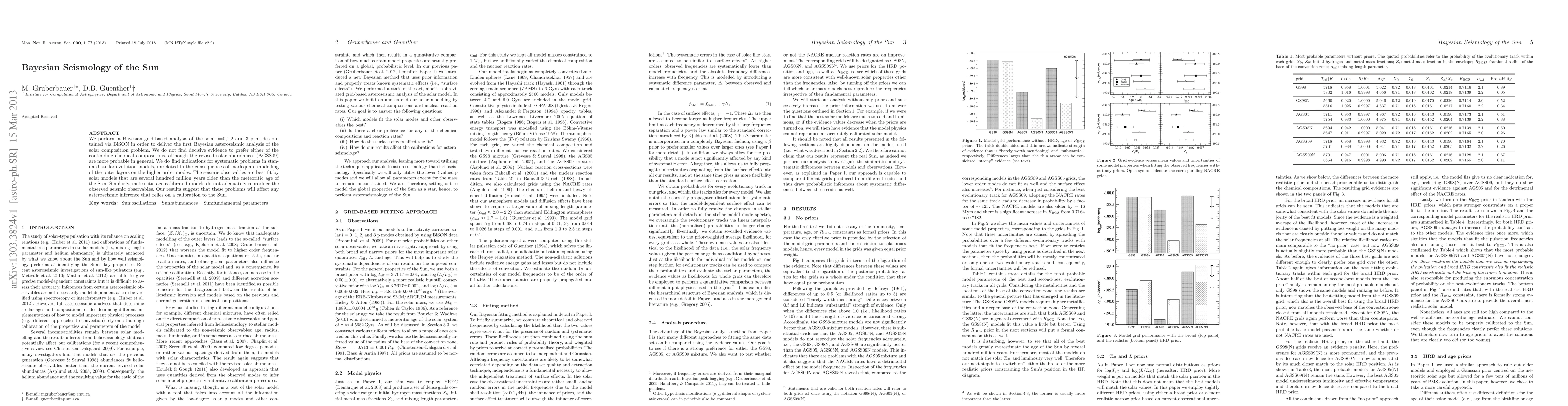 We perform a Bayesian grid-based analysis of the solar l=0,1,2 and 3 p modes obtained via BiSON in order to deliver the first Bayesian asteroseismic analysis of the solar composition problem. We do not find decisive evidence to prefer either of the contending chemical compositions, although the revised solar abundances (AGSS09) are more probable in general. We do find indications for systematic problems in standard stellar evolution models, unrelated to the consequences of inadequate modelling of the outer layers on the higher-order modes. The seismic observables are best fit by solar models that are several hundred million years older than the meteoritic age of the Sun. Similarly, meteoritic age calibrated models do not adequately reproduce the observed seismic observables. Our results suggest that these problems will affect any asteroseismic inference that relies on a calibration to the Sun.