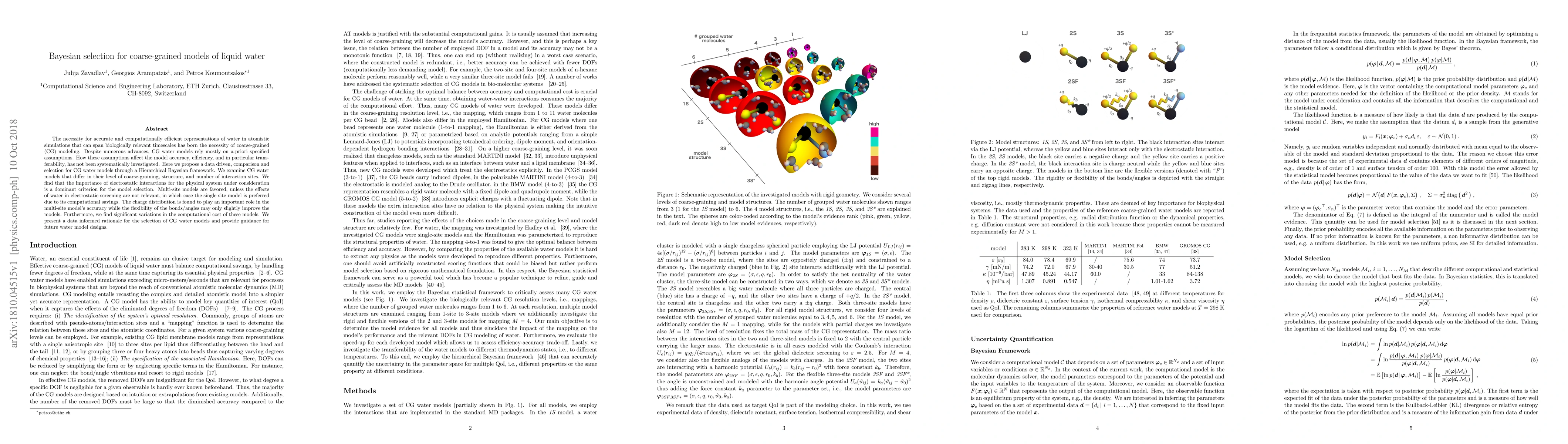 This paper proposes a Bayesian framework for selecting coarse-grained water models based on data-driven comparisons, finding that electrostatic interactions and charge distribution significantly impact model accuracy, with multi-site models generally preferred unless computational efficiency is paramount.