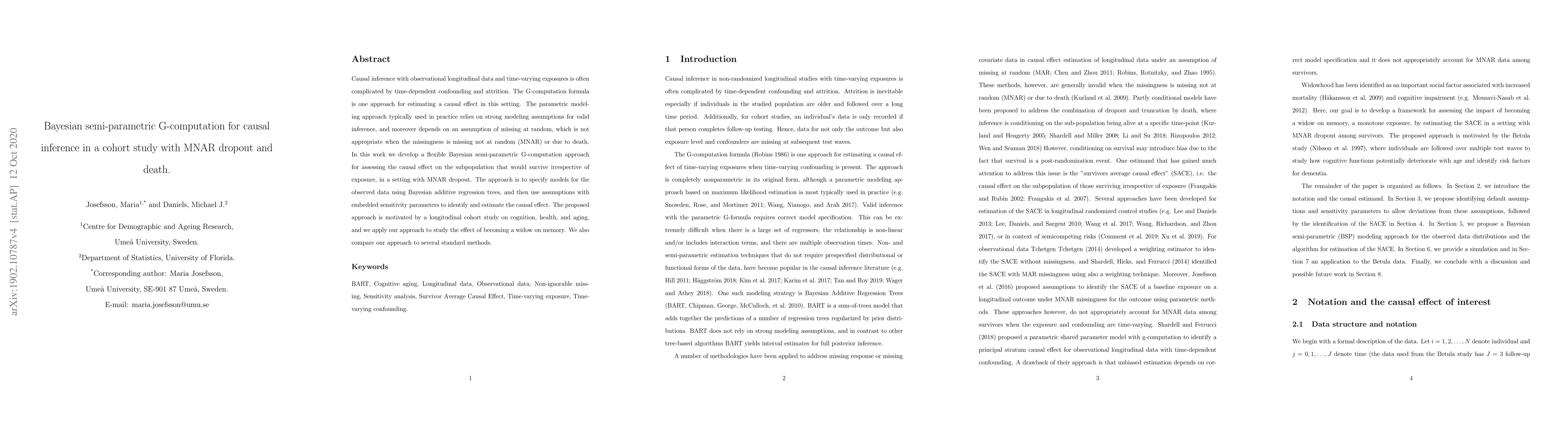 This paper proposes a Bayesian semi-parametric G-computation method for causal inference in longitudinal studies with MNAR dropout and death, using Bayesian additive regression trees to model observed data and sensitivity parameters to estimate causal effects. The method is applied to assess the impact of widowhood on memory in a cohort study on aging.