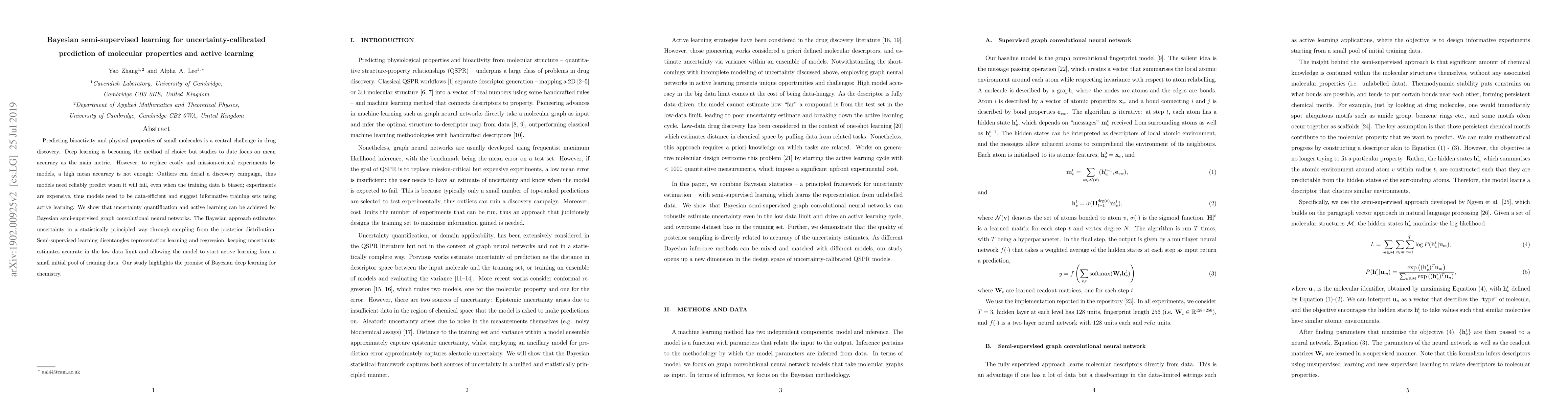Predicting bioactivity and physical properties of small molecules is a central challenge in drug discovery. Deep learning is becoming the method of choice but studies to date focus on mean accuracy as the main metric. However, to replace costly and mission-critical experiments by models, a high mean accuracy is not enough: Outliers can derail a discovery campaign, thus models need reliably predict when it will fail, even when the training data is biased; experiments are expensive, thus models need to be data-efficient and suggest informative training sets using active learning. We show that uncertainty quantification and active learning can be achieved by Bayesian semi-supervised graph convolutional neural networks. The Bayesian approach estimates uncertainty in a statistically principled way through sampling from the posterior distribution. Semi-supervised learning disentangles representation learning and regression, keeping uncertainty estimates accurate in the low data limit and allowing the model to start active learning from a small initial pool of training data. Our study highlights the promise of Bayesian deep learning for chemistry.