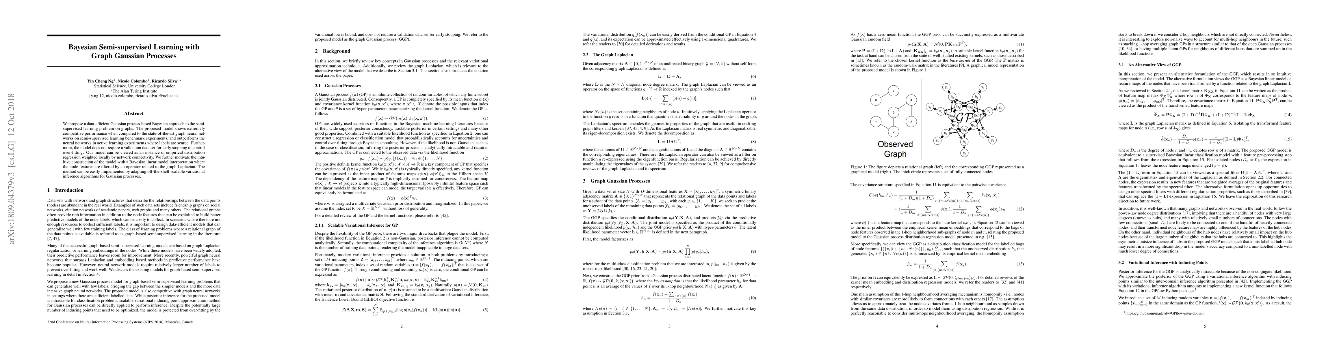 This paper introduces a Bayesian semi-supervised learning method using graph Gaussian processes, achieving competitive performance against state-of-the-art graph neural networks, especially in scenarios with limited labeled data. The model avoids the need for validation data and can be efficiently implemented using scalable variational inference.