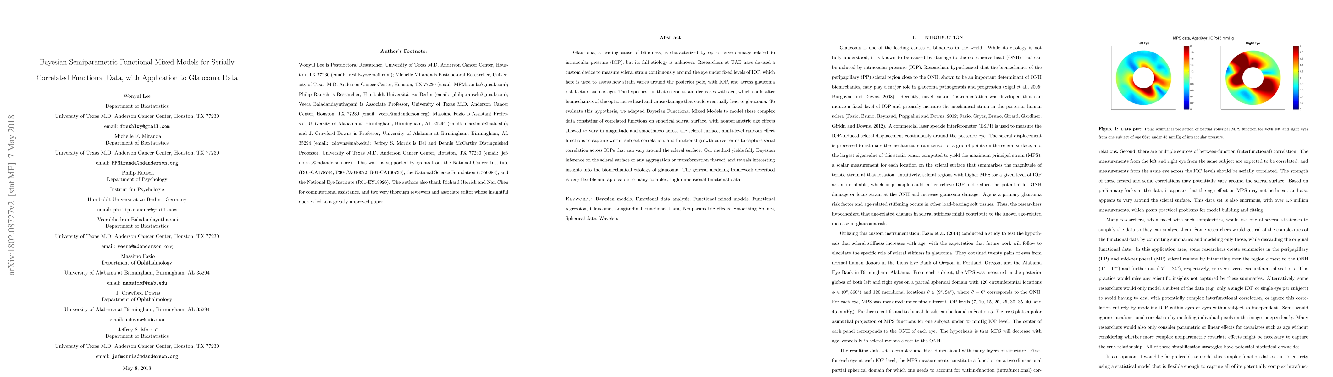 This paper proposes Bayesian semiparametric functional mixed models to analyze serially correlated functional data from glaucoma research, specifically focusing on scleral strain measurements. The study reveals insights into the biomechanical etiology of glaucoma by modeling the variation of scleral strain with age and intraocular pressure, suggesting that age-related decreases in scleral strain may contribute to optic nerve damage.