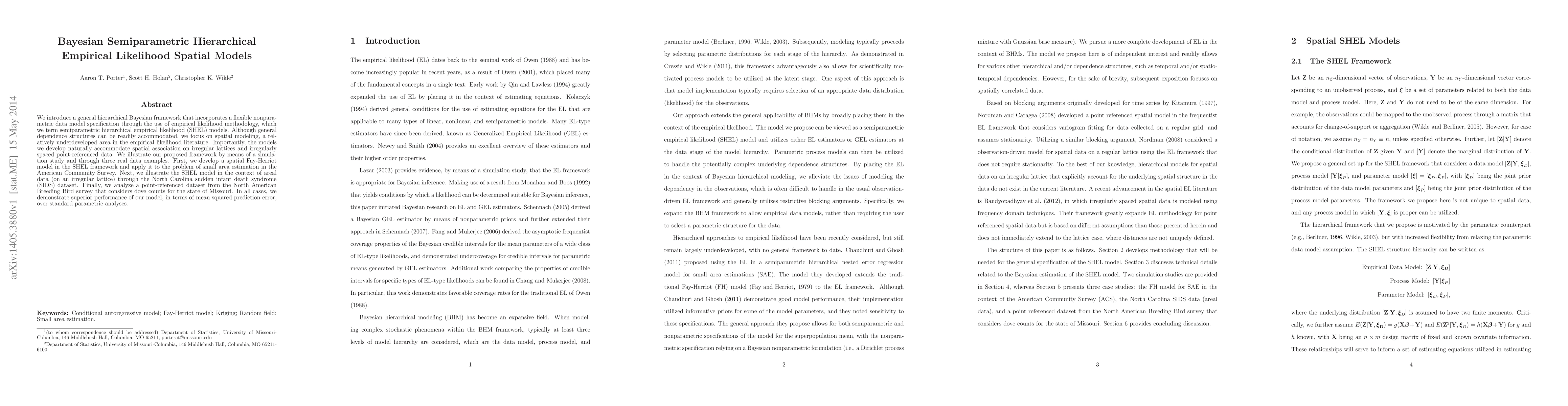 We introduce a general hierarchical Bayesian framework that incorporates a flexible nonparametric data model specification through the use of empirical likelihood methodology, which we term semiparametric hierarchical empirical likelihood (SHEL) models. Although general dependence structures can be readily accommodated, we focus on spatial modeling, a relatively underdeveloped area in the empirical likelihood literature. Importantly, the models we develop naturally accommodate spatial association on irregular lattices and irregularly spaced point-referenced data. We illustrate our proposed framework by means of a simulation study and through three real data examples. First, we develop a spatial Fay-Herriot model in the SHEL framework and apply it to the problem of small area estimation in the American Community Survey. Next, we illustrate the SHEL model in the context of areal data (on an irregular lattice) through the North Carolina sudden infant death syndrome (SIDS) dataset. Finally, we analyze a point-referenced dataset from the North American Breeding Bird survey that considers dove counts for the state of Missouri. In all cases, we demonstrate superior performance of our model, in terms of mean squared prediction error, over standard parametric analyses.
