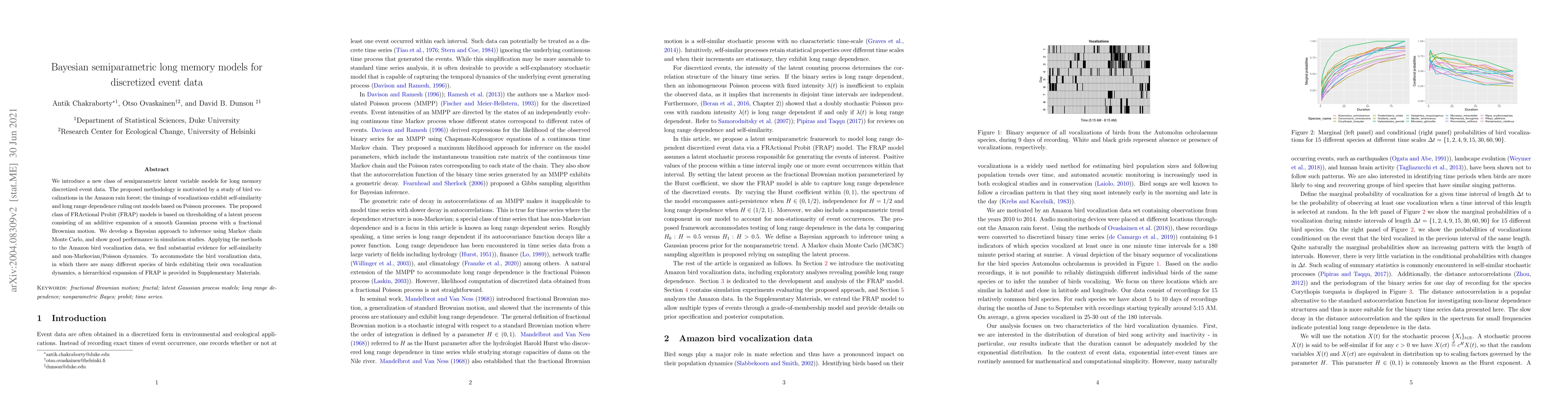This paper introduces semiparametric latent variable models, specifically FRActional Probit (FRAP) models, for analyzing long memory discretized event data, such as bird vocalizations in the Amazon. The Bayesian approach using Markov chain Monte Carlo shows good performance and reveals self-similarity and non-Markovian dynamics in the data.