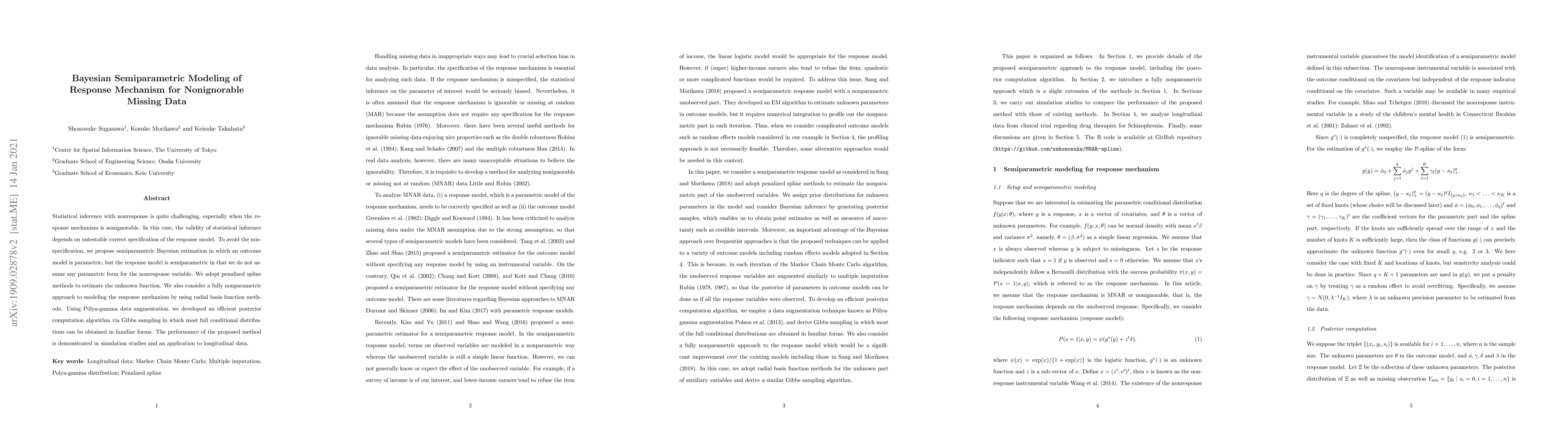Statistical inference with nonresponse is quite challenging, especially when the response mechanism is nonignorable. In this case, the validity of statistical inference depends on untestable correct specification of the response model. To avoid the misspecification, we propose semiparametric Bayesian estimation in which an outcome model is parametric, but the response model is semiparametric in that we do not assume any parametric form for the nonresponse variable. We adopt penalized spline methods to estimate the unknown function. We also consider a fully nonparametric approach to modeling the response mechanism by using radial basis function methods. Using Polya-gamma data augmentation, we developed an efficient posterior computation algorithm via Gibbs sampling in which most full conditional distributions can be obtained in familiar forms. The performance of the proposed method is demonstrated in simulation studies and an application to longitudinal data.