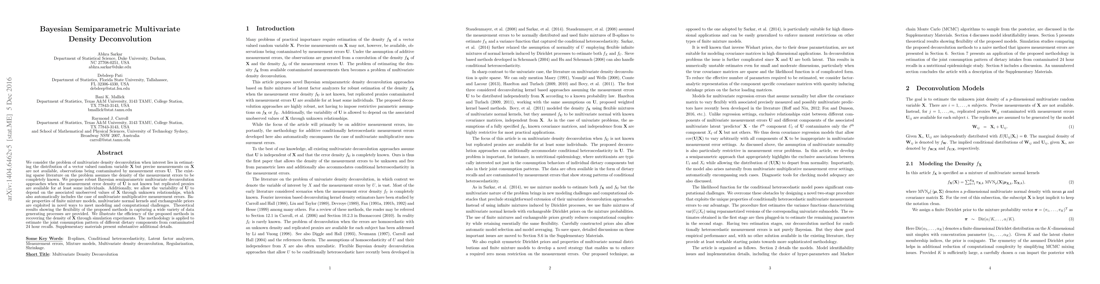 This paper proposes robust Bayesian semiparametric multivariate density deconvolution methods to estimate the distribution of a vector-valued random variable when precise measurements are unavailable due to additive measurement errors. The approach handles unknown measurement error densities and variable error variability, illustrated through simulations and applied to dietary consumption data.